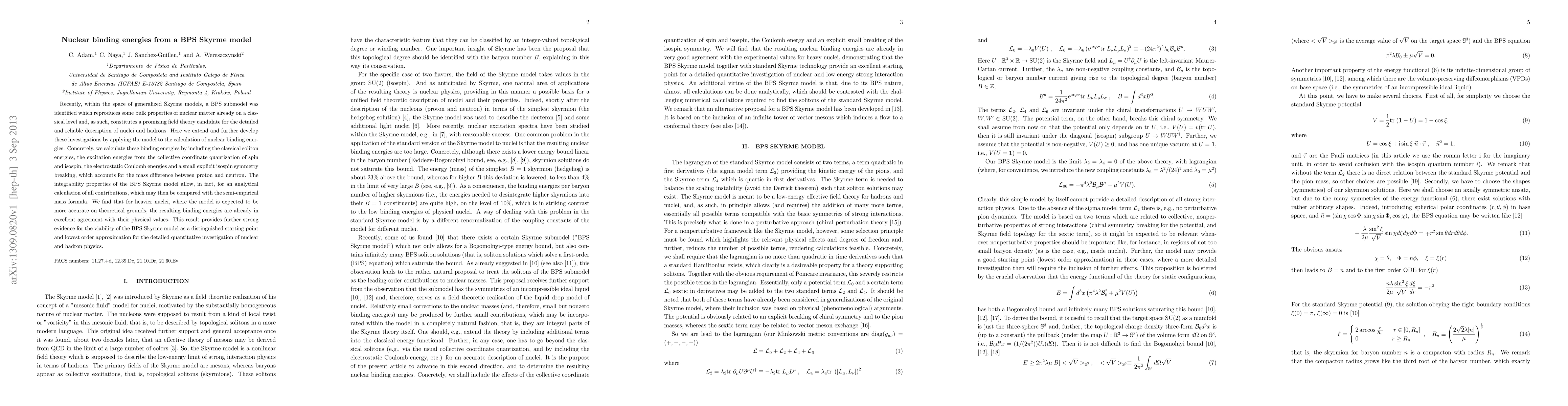 This paper develops a BPS Skyrme model to calculate nuclear binding energies, combining classical soliton energies, excitation energies, Coulomb energies, and isospin symmetry breaking. The model's integrability allows analytical calculations that match well with semi-empirical mass formulas, especially for heavier nuclei, underscoring the model's potential in nuclear and hadron physics.