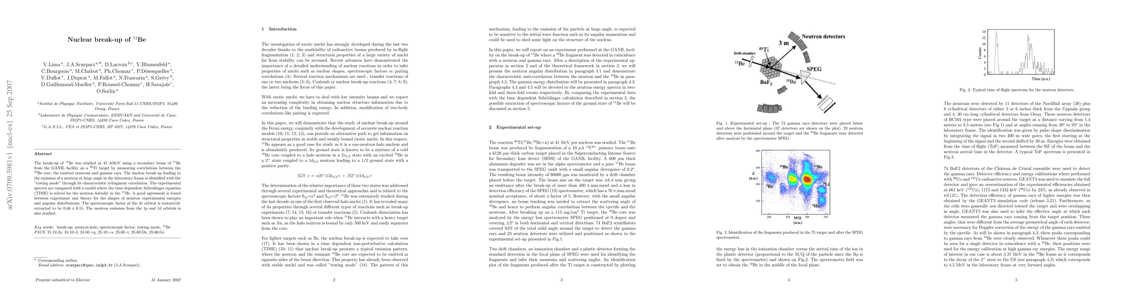 This study investigates the nuclear break-up of 11Be at 41AMeV using a secondary beam from GANIL, focusing on correlations between emitted neutrons and gamma rays. The towing mode is identified by n-fragment correlations, and the TDSE model shows good agreement with experimental data for neutron energies and angular distributions, extracting a spectroscopic factor of 0.46±0.15 for the 2s orbital.