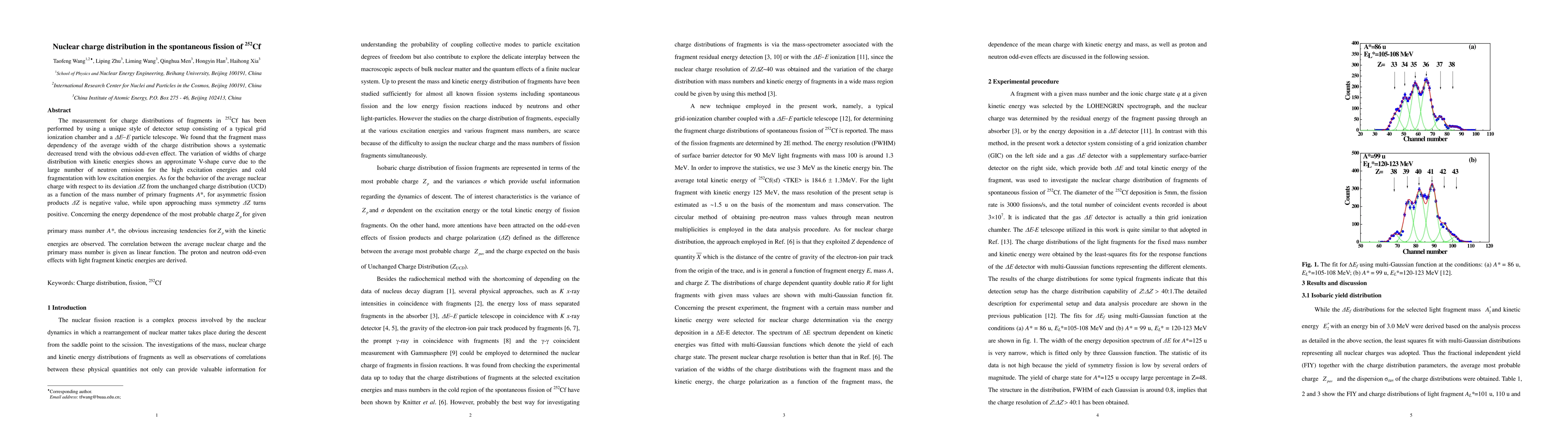 This study measures nuclear charge distributions in 252Cf's spontaneous fission using a grid ionization chamber and a particle telescope. Key findings include a systematic decrease in charge distribution width with mass, an odd-even effect, V-shaped width variation with kinetic energy, and charge deviation trends with mass and energy. Proton-neutron odd-even effects with light fragments are also derived.