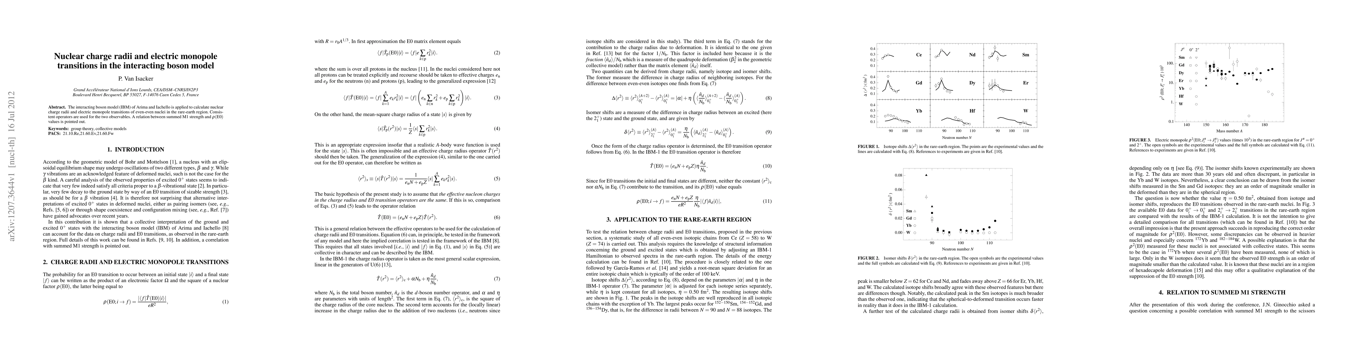 The interacting boson model (IBM) of Arima and Iachello is applied to calculate nuclear charge radii and electric monopole transitions of even-even nuclei in the rare-earth region. Consistent operators are used for the two observables. A relation between summed M1 strength and $\rho({\rm E0})$ values is pointed out.