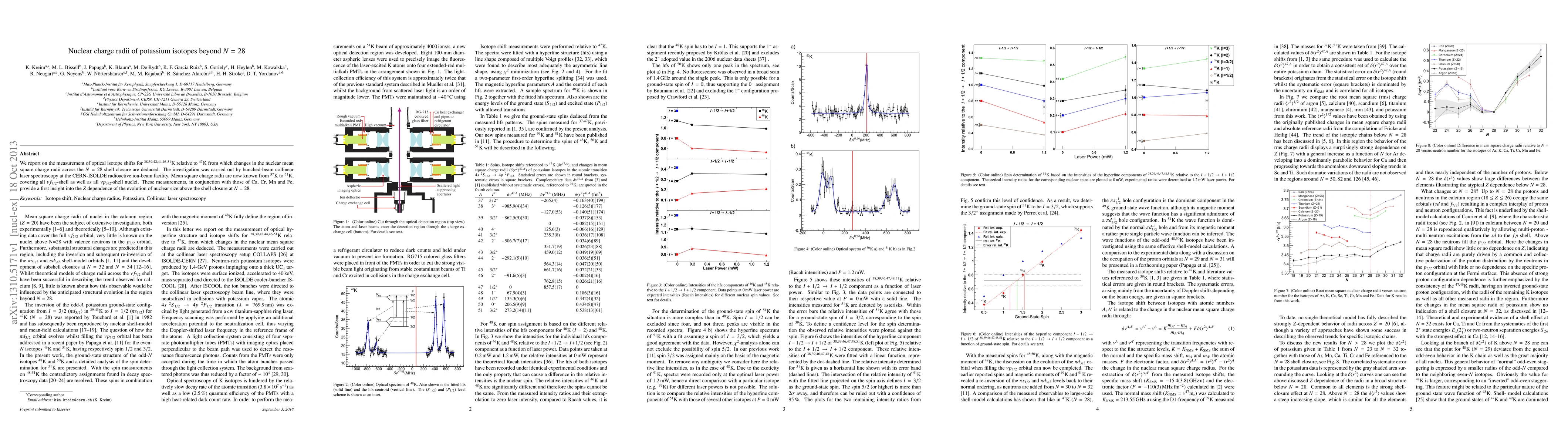 This paper reports on precise measurements of nuclear charge radii for potassium isotopes using laser spectroscopy at CERN-ISOLDE, revealing changes in nuclear size across the N=28 shell closure. The findings provide insights into the evolution of nuclear size with atomic number beyond this shell closure.