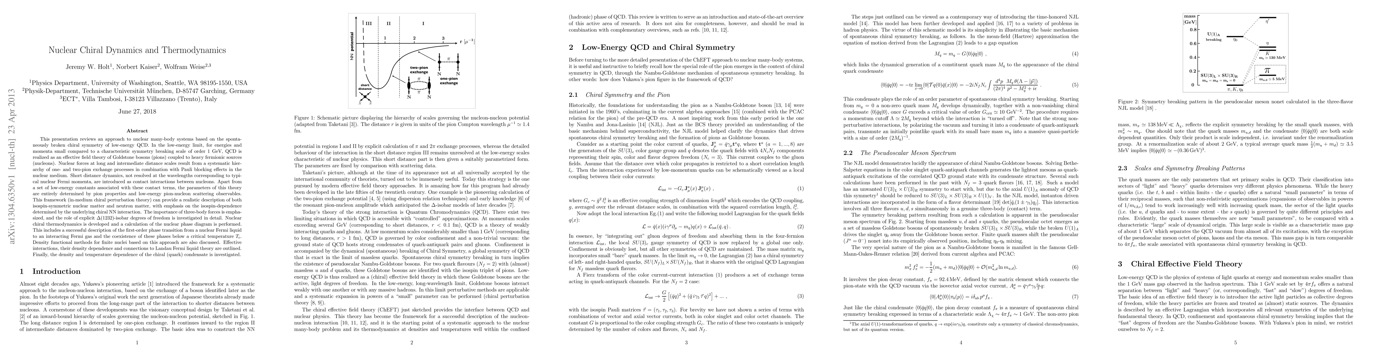 This paper presents an effective field theory approach to nuclear many-body systems based on chiral symmetry breaking in QCD, focusing on pion-nucleon interactions and the role of three-body forces. It develops nuclear chiral thermodynamics and calculates the nuclear phase diagram, highlighting the first-order phase transition and density functional methods for finite nuclei.