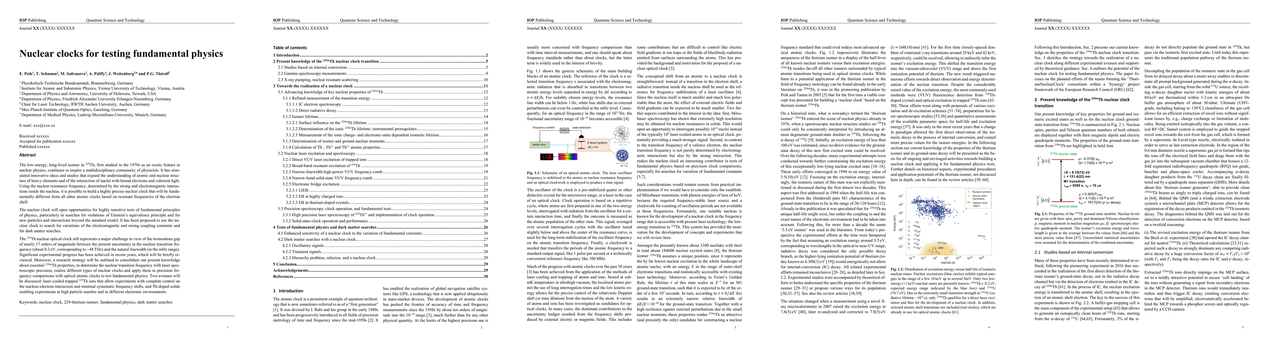 The low-energy, long-lived isomer in $^{229}$Th, first studied in the 1970s as an exotic feature in nuclear physics, continues to inspire a multidisciplinary community of physicists. Using the nuclear resonance frequency, determined by the strong and electromagnetic interactions inside the nucleus, it is possible to build a highly precise nuclear clock that will be fundamentally different from all other atomic clocks based on resonant frequencies of the electron shell. The nuclear clock will open opportunities for highly sensitive tests of fundamental principles of physics, particularly in searches for violations of Einstein's equivalence principle and for new particles and interactions beyond the standard model. It has been proposed to use the nuclear clock to search for variations of the electromagnetic and strong coupling constants and for dark matter searches. The $^{229}$Th nuclear optical clock still represents a major challenge in view of the tremendous gap of nearly 17 orders of magnitude between the present uncertainty in the nuclear transition frequency and the natural linewidth. Significant experimental progress has been achieved in recent years, which will be briefly reviewed. Moreover, a research strategy will be outlined to consolidate our present knowledge about essential $^{229\rm{m}}$Th properties, to determine the nuclear transition frequency with laser spectroscopic precision, realize different types of nuclear clocks and apply them in precision frequency comparisons with optical atomic clocks to test fundamental physics. Two avenues will be discussed: laser-cooled trapped $^{229}$Th ions that allow experiments with complete control on the nucleus-electron interaction and minimal systematic frequency shifts, and Th-doped solids enabling experiments at high particle number and in different electronic environments.