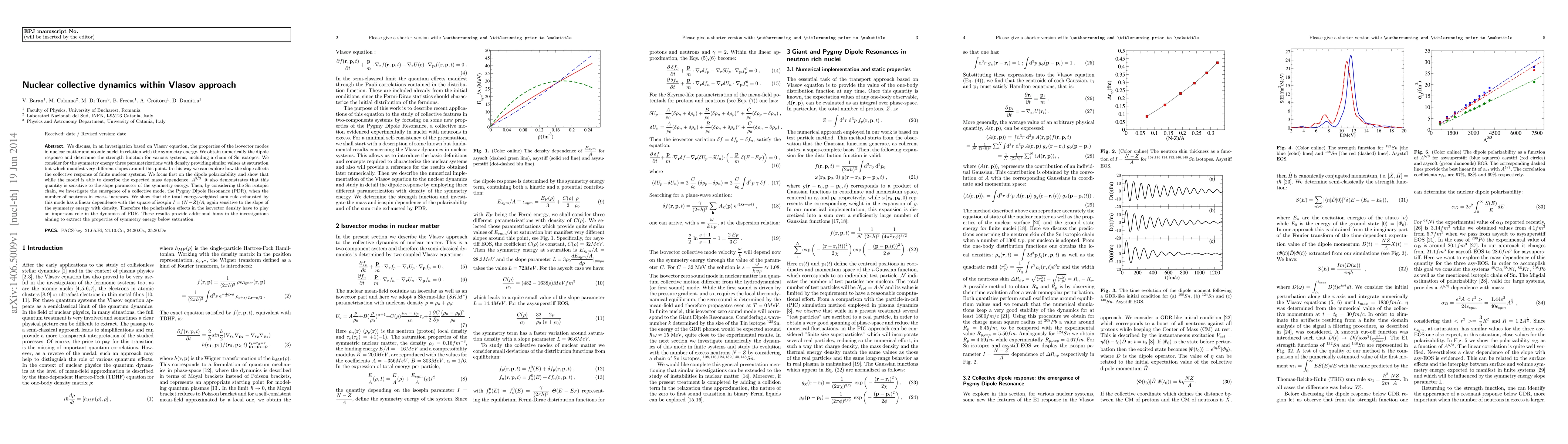 This paper investigates nuclear collective dynamics using the Vlasov approach, focusing on isovector modes and their relation to symmetry energy. It finds that the dipole polarizability depends on the slope of the symmetry energy, and explores the emergence of the Pygmy Dipole Resonance in Sn isotopes, showing a linear dependence on isospin influenced by the symmetry energy's slope.