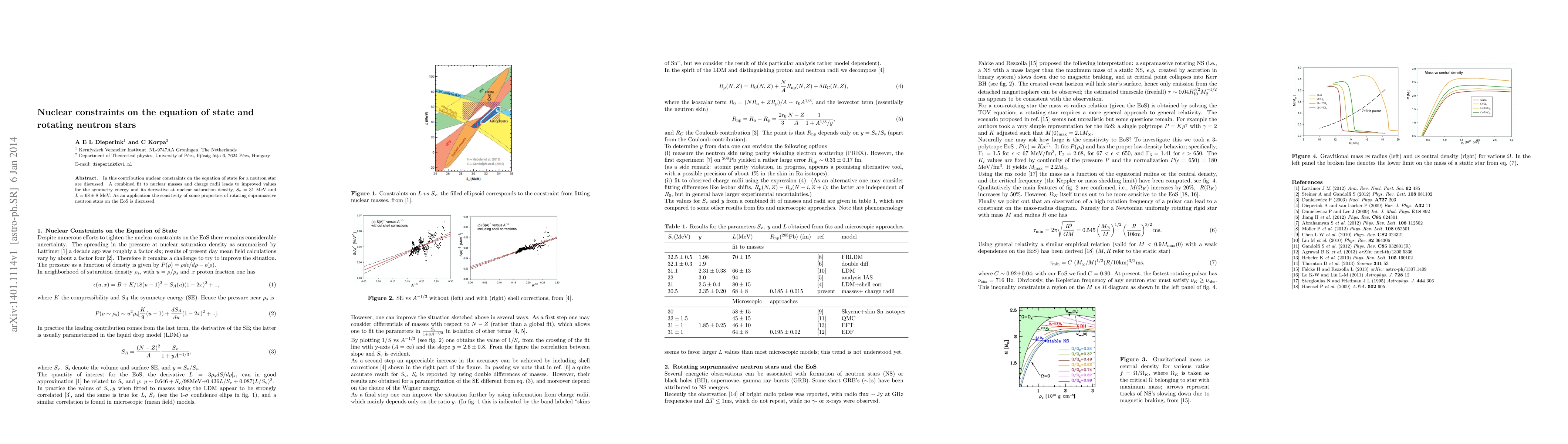 This paper discusses nuclear constraints on the neutron star equation of state (EoS), deriving improved values for symmetry energy and its derivative, and explores the impact of these constraints on the properties of rotating supramassive neutron stars.