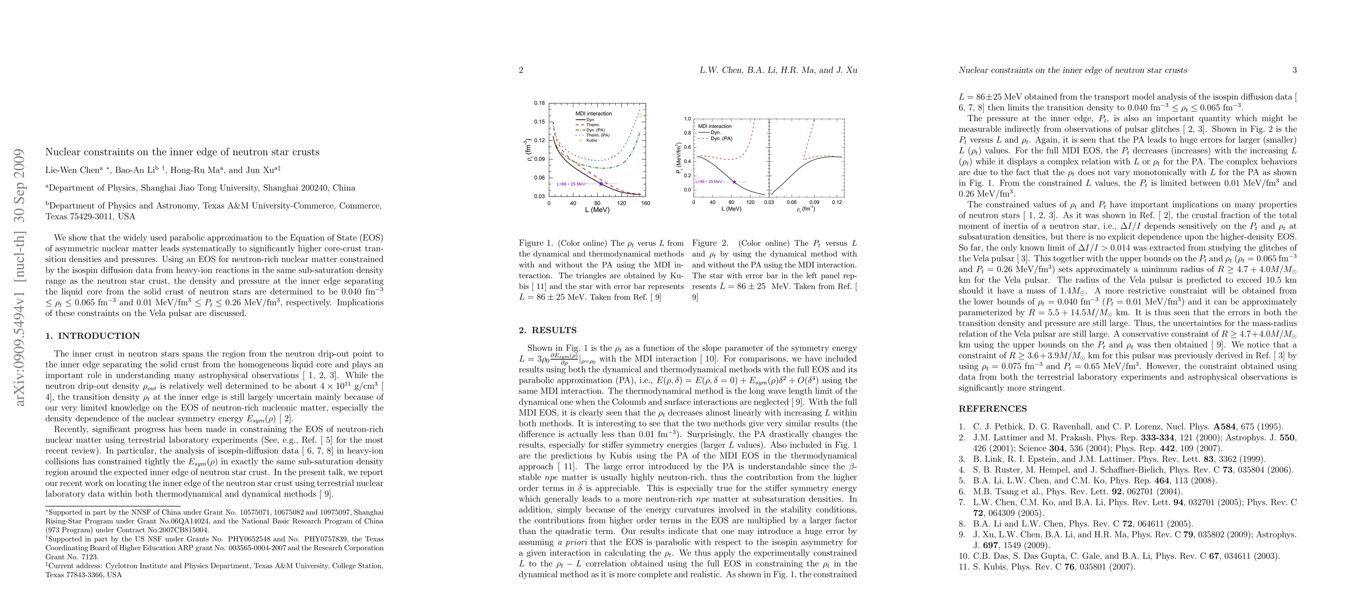 This paper determines the density and pressure at the inner edge of neutron star crusts, finding them to be 0.040 fm$^{-3}$ $\leq \rho_{t}\leq 0.065$ fm$^{-3}$ and 0.01 MeV/fm$^{3}$ $\leq P_{t}\leq 0.26$ MeV/fm$^{3}$, using a constrained EOS based on isospin diffusion data. Implications for the Vela pulsar are also discussed.