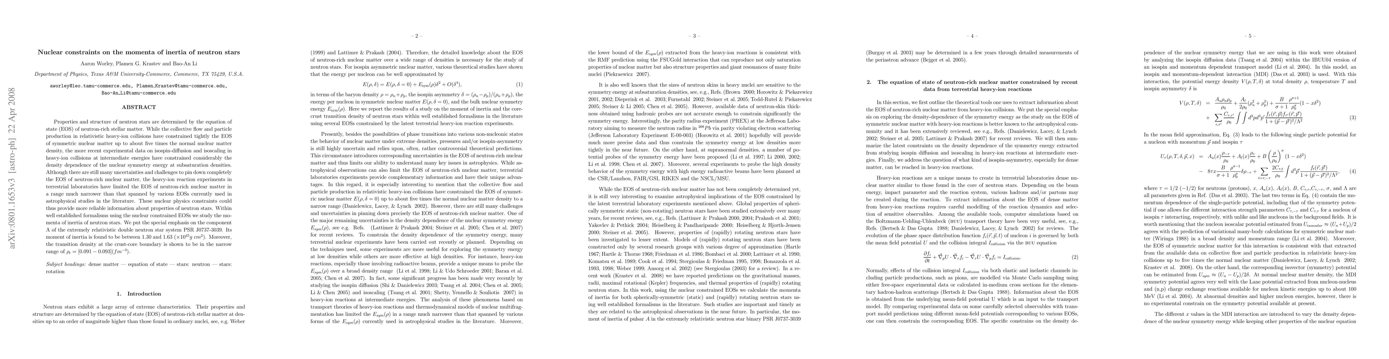 Properties and structure of neutron stars are determined by the equation of state (EOS) of neutron-rich stellar matter. While the collective flow and particle production in relativistic heavy-ion collisions have constrained tightly the EOS of symmetric nuclear matter up to about five times the normal nuclear matter density, the more recent experimental data on isospin-diffusion and isoscaling in heavy-ion collisions at intermediate energies have constrained considerably the density dependence of the nuclear symmetry energy at subsaturation densities. Although there are still many uncertainties and challenges to pin down completely the EOS of neutron-rich nuclear matter, the heavy-ion reaction experiments in terrestrial laboratories have limited the EOS of neutron-rich nuclear matter in a range much narrower than that spanned by various EOSs currently used in astrophysical studies in the literature. These nuclear physics constraints could thus provide more reliable information about properties of neutron stars. Within well established formalisms using the nuclear constrained EOSs we study the momenta of inertia of neutron stars. We put the special emphasis on the component A of the extremely relativistic double neutron star system PSR J0737-3039. Its moment of inertia is found to be between 1.30 and 1.63 $(\times10^{45}g$ $cm^2)$. Moreover, the transition density at the crust-core boundary is shown to be in the narrow range of $\rho_t=[0.091-0.093](fm^{-3})$.