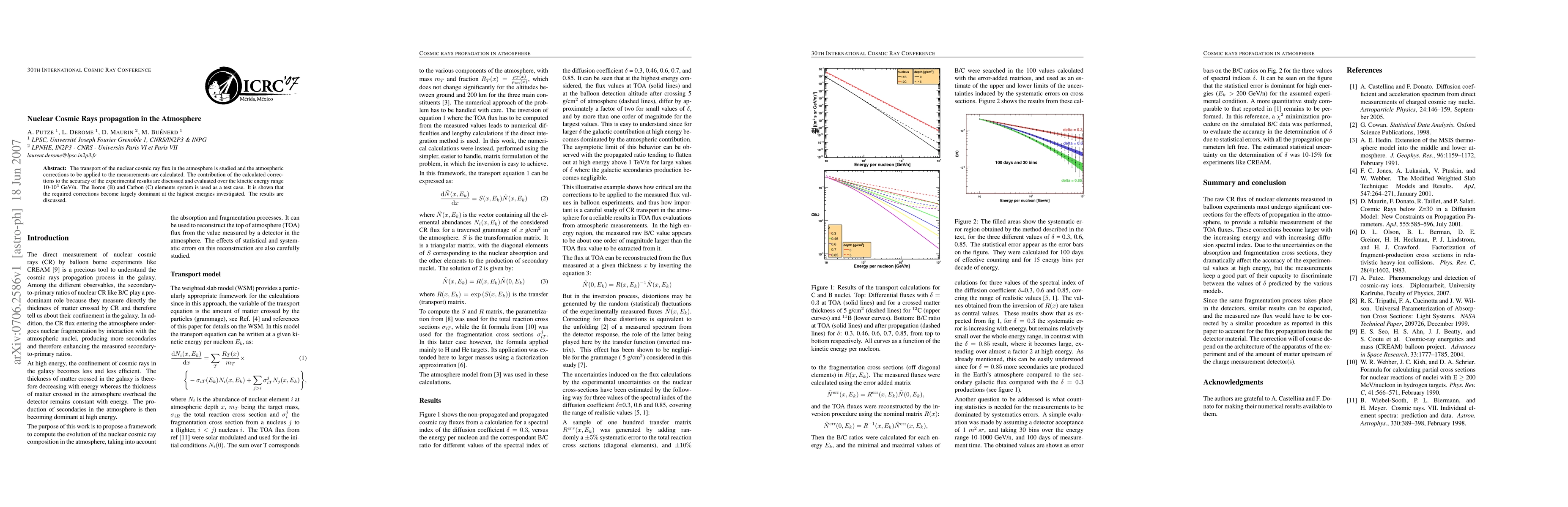 The transport of the nuclear cosmic ray flux in the atmosphere is studied and the atmospheric corrections to be applied to the measurements are calculated. The contribution of the calculated corrections to the accuracy of the experimental results are discussed and evaluated over the kinetic energy range 10-10$^{3}$ GeV/n. The Boron (B) and Carbon (C) elements system is used as a test case. It is shown that the required corrections become largely dominant at the highest energies investigated. The results are discussed.