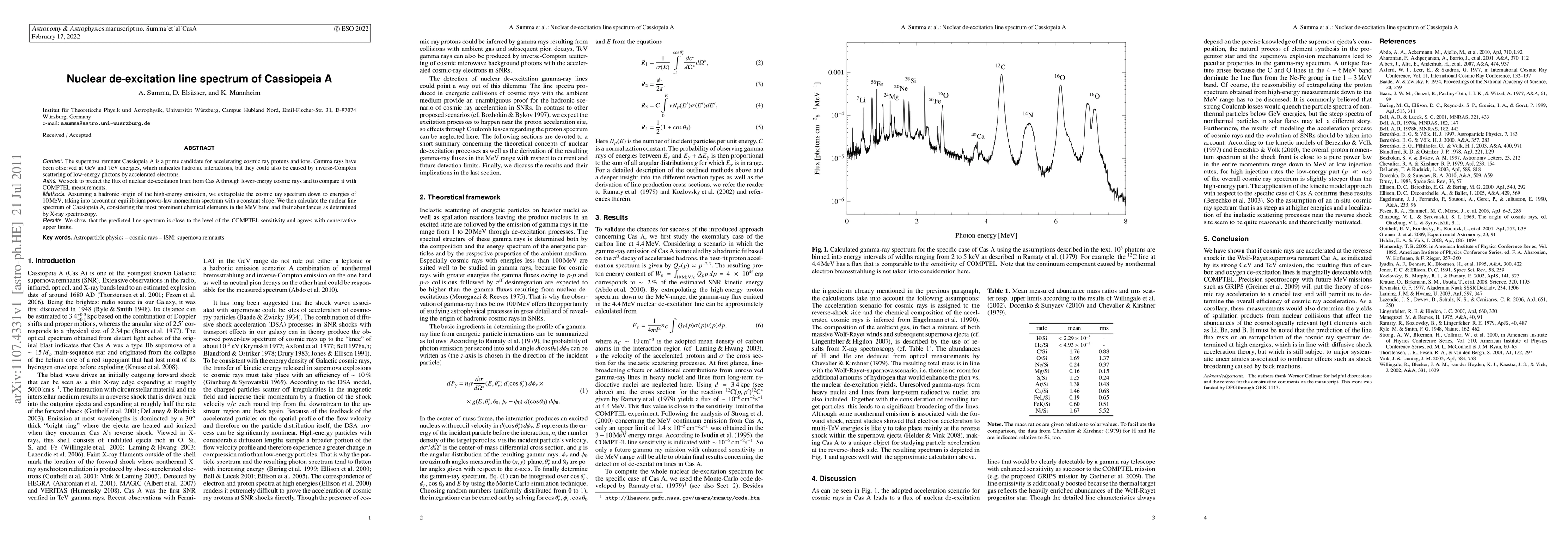 This paper investigates the nuclear de-excitation line spectrum of the Cassiopeia A supernova remnant, predicting the flux of these lines from lower-energy cosmic rays and comparing it with COMPTEL measurements. The study supports a hadronic origin for high-energy gamma rays and finds the predicted line spectrum aligns with COMPTEL's sensitivity and upper limits.