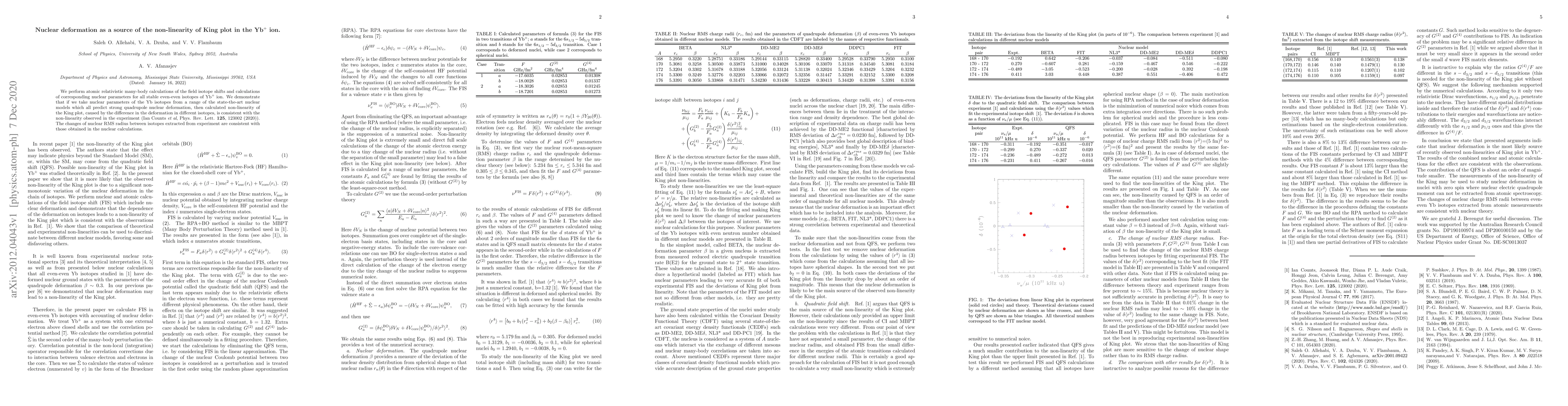 We perform atomic relativistic many-body calculations of the field isotope shifts and calculations of corresponding nuclear parameters for all stable even-even isotopes of Yb$^+$ ion. We demonstrate that if we take nuclear parameters of the Yb isotopes from a range of the state-the-art nuclear models which all predict strong quadrupole nuclear deformation, then calculated non-linearity of the King plot, caused by the difference in the deformation in different isotopes, is consistent with the non-linearity observed in the experiment (Ian Counts {\em et al}, Phys. Rev. Lett. {\bf 125}, 123002 (2020)). The changes of nuclear RMS radius between isotopes extracted from experiment are consistent with those obtained in the nuclear calculations.