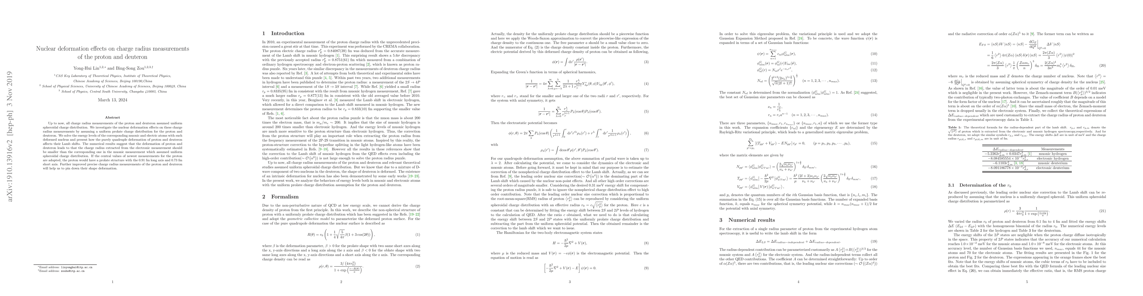 This study investigates the impact of nuclear deformation on charge radius measurements of the proton and deuteron, finding that deformation leads to a smaller charge radius from electronic measurements compared to muonic ones. The proton is suggested to have a prolate structure with a long axis of 0.91 fm and a short axis of 0.73 fm.