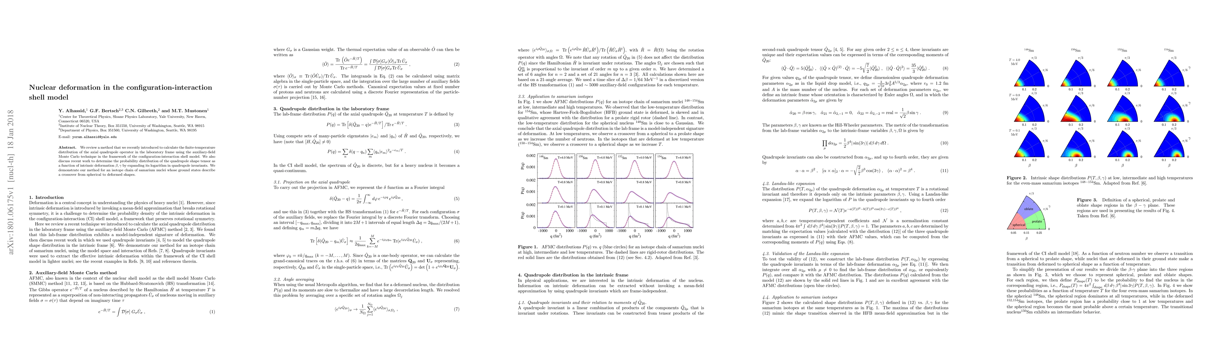 This paper reviews a novel method using the configuration-interaction shell model and auxiliary-field Monte Carlo to calculate finite-temperature axial quadrupole distributions in samarium nuclei, demonstrating a shape transition from spherical to deformed configurations. It also explores the probability distribution of the quadrupole shape tensor in terms of intrinsic deformation parameters.