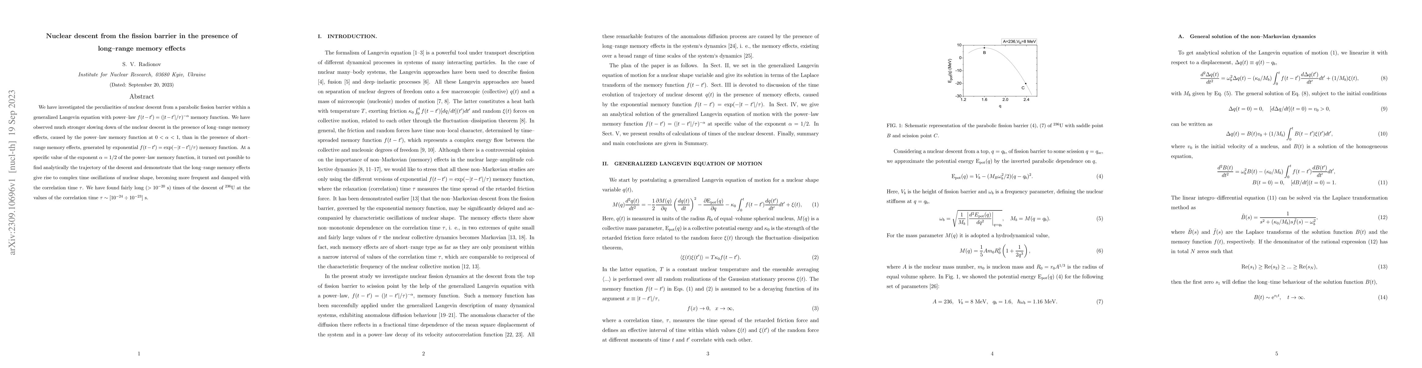 This paper investigates nuclear descent through a fission barrier using a generalized Langevin equation with a power-law memory function, revealing significantly slower descent due to long-range memory effects compared to short-range memory. At $\alpha=1/2$, the descent exhibits complex oscillations and prolonged times, indicating the influence of long-range memory on nuclear dynamics.