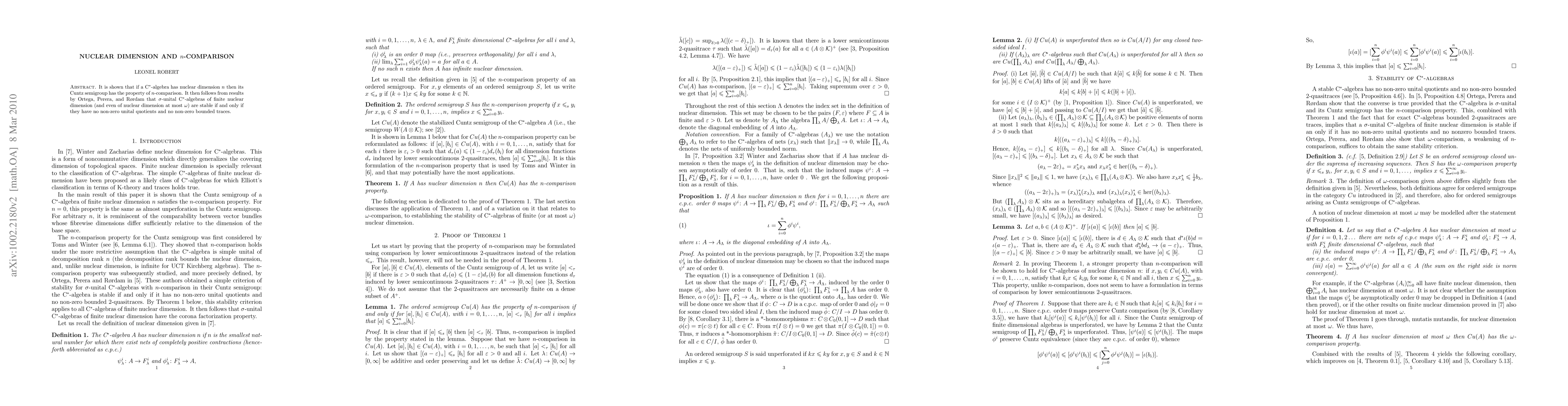 The paper establishes that C*-algebras with nuclear dimension $n$ possess the $n$-comparison property in their Cuntz semigroup. Consequently, stable $\sigma$-unital C*-algebras of finite or countable nuclear dimension are characterized by the absence of non-zero unital quotients and bounded traces.