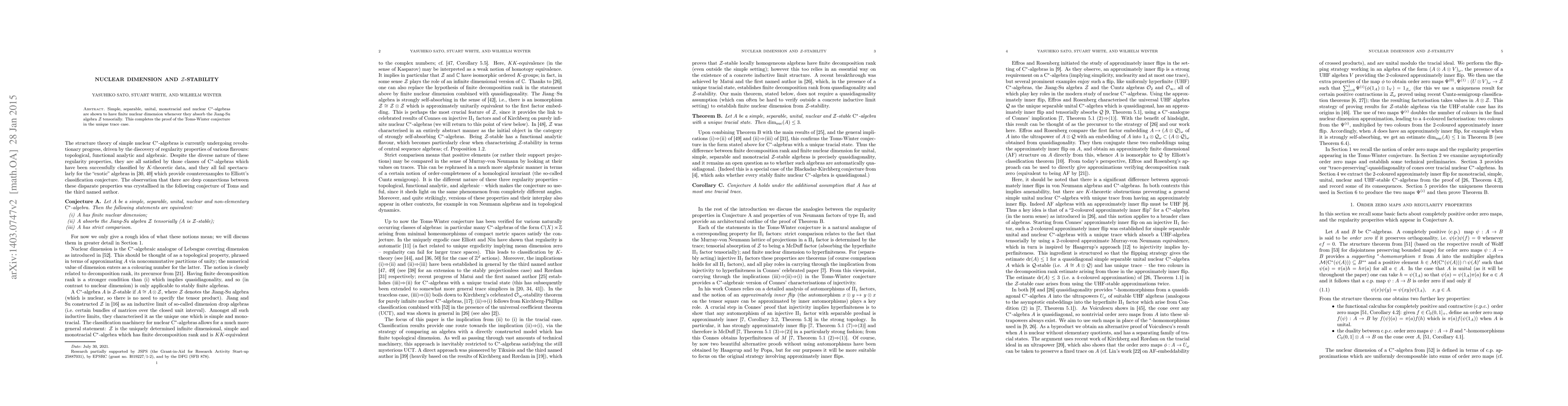 This research proves that certain C$^*$-algebras, when absorbing the Jiang-Su algebra $mathcal{Z}$ tensorially, have finite nuclear dimension, thus confirming the Toms-Winter conjecture for unique trace cases.