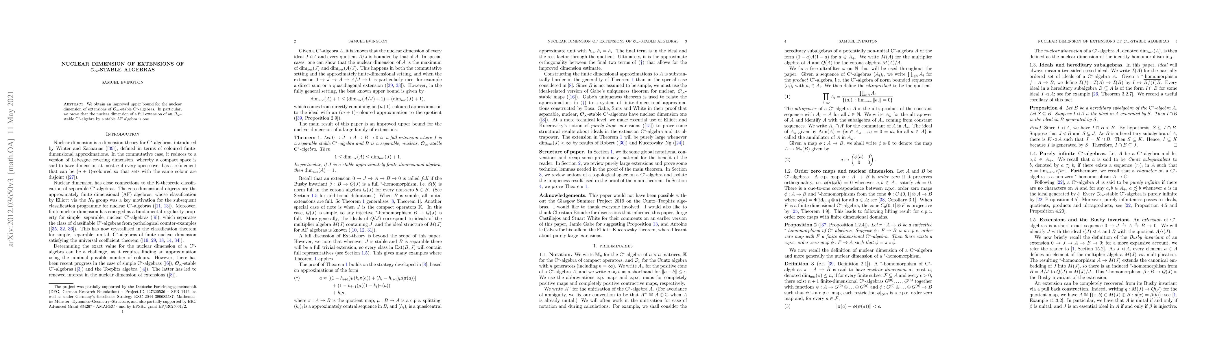 Summary: This paper improves the upper bound for the nuclear dimension of extensions of $\mathcal{O}_\infty$-stable $\rm{C}^*$-algebras, proving that the nuclear dimension of a full extension by a stable AF algebra is exactly one. This result enhances our understanding of the nuclear dimension in the context of $\mathcal{O}_\infty$-stable algebras.