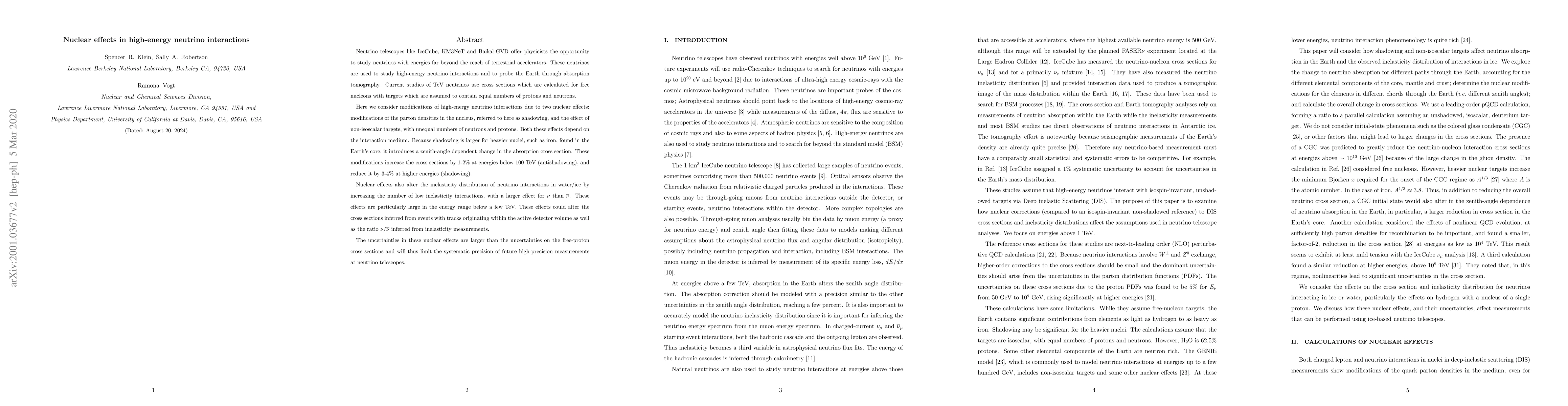 Neutrino telescopes like IceCube, KM3NeT and Baikal-GVD offer physicists the opportunity to study neutrinos with energies far beyond the reach of terrestrial accelerators. These neutrinos are used to study high-energy neutrino interactions and to probe the Earth through absorption tomography. Current studies of TeV neutrinos use cross sections which are calculated for free nucleons with targets which are assumed to contain equal numbers of protons and neutrons. Here we consider modifications of high-energy neutrino interactions due to two nuclear effects: modifications of the parton densities in the nucleus, referred to here as shadowing, and the effect of non-isoscalar targets, with unequal numbers of neutrons and protons. Both these effects depend on the interaction medium. Because shadowing is larger for heavier nuclei, such as iron, found in the Earth's core, it introduces a zenith-angle dependent change in the absorption cross section. These modifications increase the cross sections by 1-2\% at energies below 100 TeV (antishadowing), and reduce it by 3-4\% at higher energies (shadowing). Nuclear effects also alter the inelasticity distribution of neutrino interactions in water/ice by increasing the number of low inelasticity interactions, with a larger effect for $\nu$ than $\bar\nu$. These effects are particularly large in the energy range below a few TeV. These effects could alter the cross sections inferred from events with tracks originating within the active detector volume as well as the ratio $\nu/\bar\nu$ inferred from inelasticity measurements. The uncertainties in these nuclear effects are larger than the uncertainties on the free-proton cross sections and will thus limit the systematic precision of future high-precision measurements at neutrino telescopes.