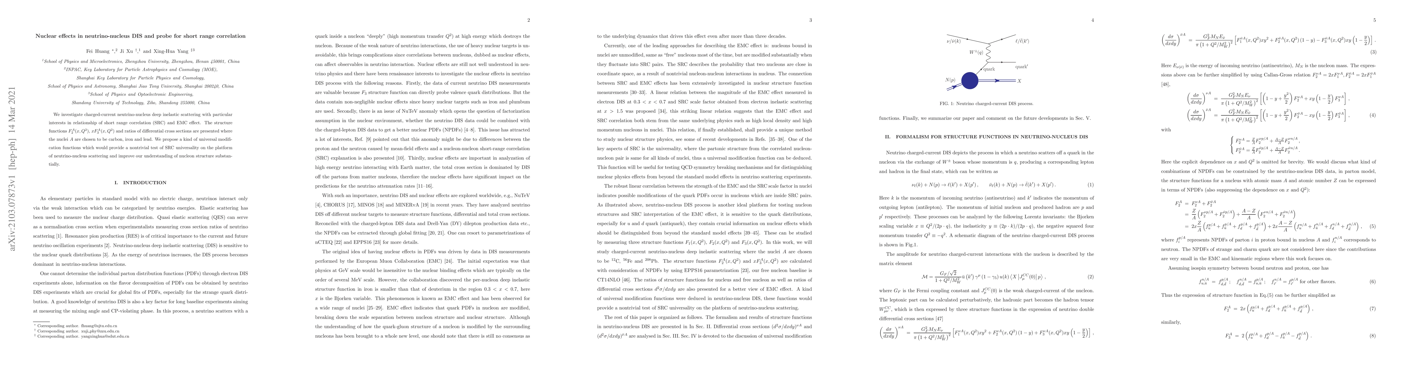This paper explores charged-current neutrino-nucleus deep inelastic scattering to study the relationship between short range correlations (SRC) and the EMC effect. It presents structure functions for carbon, iron, and lead, proposing universal modification functions to test SRC universality and enhance understanding of nucleon structure.