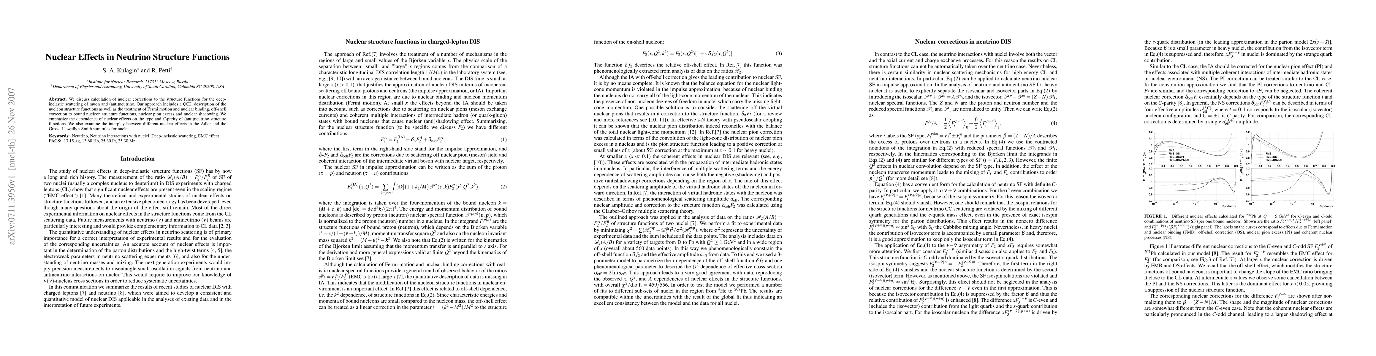 We discuss calculation of nuclear corrections to the structure functions for the deep-inelastic scattering of muon and (anti)neutrino. Our approach includes a QCD description of the nucleon structure functions as well as the treatment of Fermi motion and nuclear binding, off-shell correction to bound nucleon structure functions, nuclear pion excess and nuclear shadowing. We emphasize the dependence of nuclear effects on the type and C-parity of (anti)neutrino structure functions. We also examine the interplay between different nuclear effects in the Adler and the Gross-Llewellyn-Smith sum rules for nuclei.