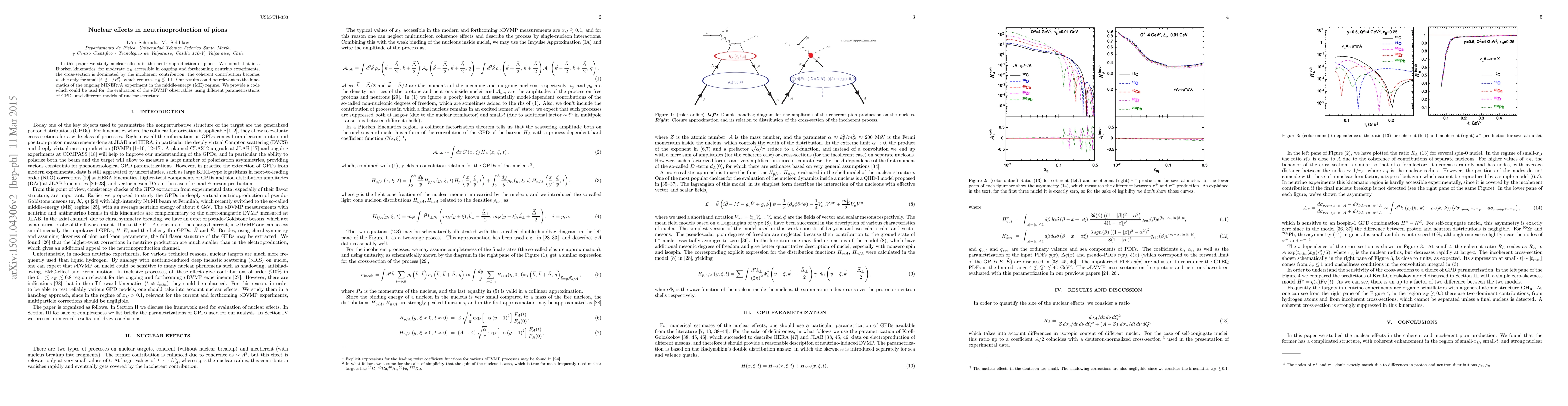 In this paper we study nuclear effects in the neutrinoproduction of pions. We found that in a Bjorken kinematics, for moderate $x_{B}$ accessible in ongoing and forthcoming neutrino experiments the cross-section is dominated by the incoherent contribution; the coherent contribution becomes visible only for small $|t|\lesssim1/R_{A}^{2}$, which requires $x_{B}\lesssim0.1$. Our results could be relevant to the kinematics of the ongoing MINERvA experiment in ME configuration. We provide a code which could be used for evaluation of the $\nu$DVMP observables using different parametrizations of GPDs and different models of nuclear structure.