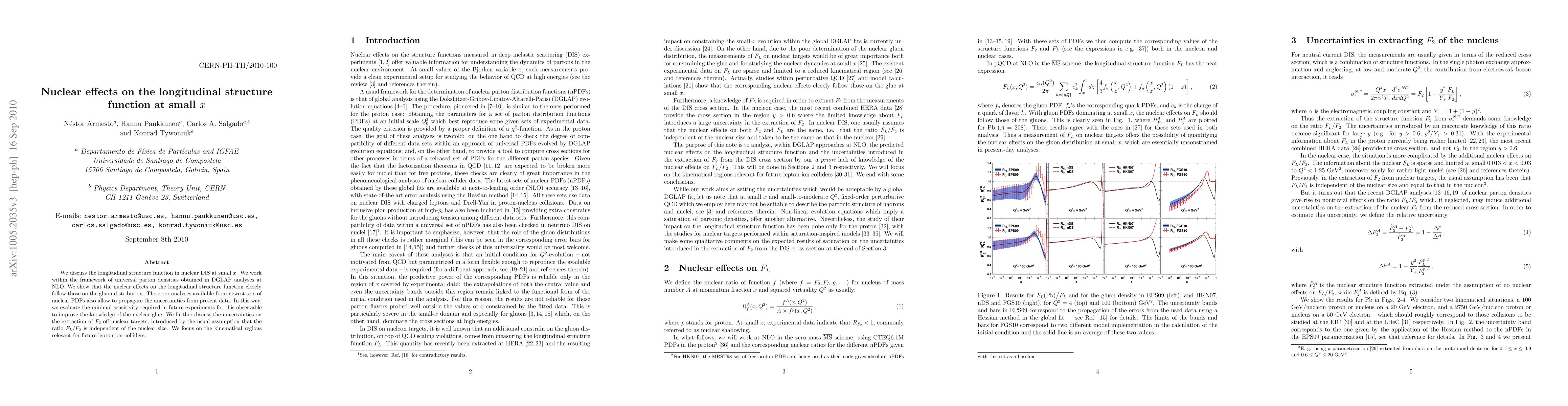 This paper investigates nuclear effects on the longitudinal structure function in deep inelastic scattering at small $x$, showing that these effects closely mirror those on the gluon distribution. The study evaluates the minimal experimental sensitivity needed to enhance the understanding of nuclear gluon dynamics, while also discussing uncertainties in extracting $F_2$ from nuclear targets due to assumptions about the $F_L/F_2$ ratio.