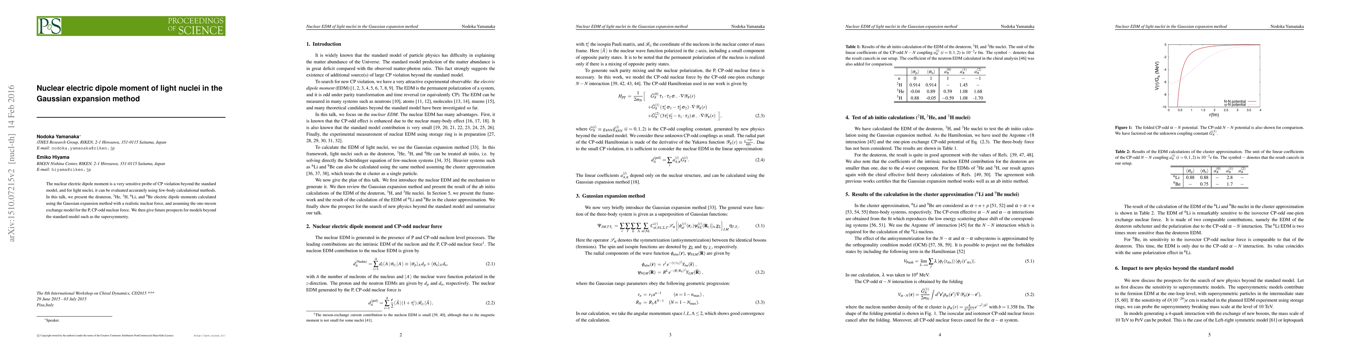 This paper evaluates the electric dipole moments of light nuclei (deuteron, $^3$He, $^3$H, $^6$Li, and $^9$Be) using the Gaussian expansion method, focusing on CP violation beyond the standard model. It discusses future prospects for models like supersymmetry.