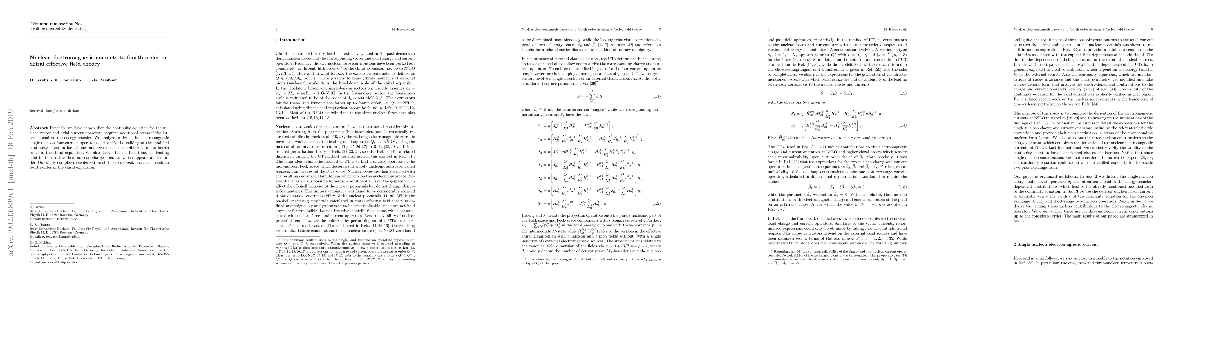 Recently, we have shown that the continuity equation for the nuclear vector and axial current operators acquires additional terms if the latter depend on the energy transfer. We analyze in detail the electromagnetic single-nucleon four-current operators and verify the validity of the modified continuity equation for all one- and two-nucleon contributions up to fourth order in the chiral expansion. We also derive, for the first time, the leading contribution to the three-nucleon charge operator which appears at this order. Our study completes the derivation of the electroweak nuclear currents to fourth order in the chiral expansion.