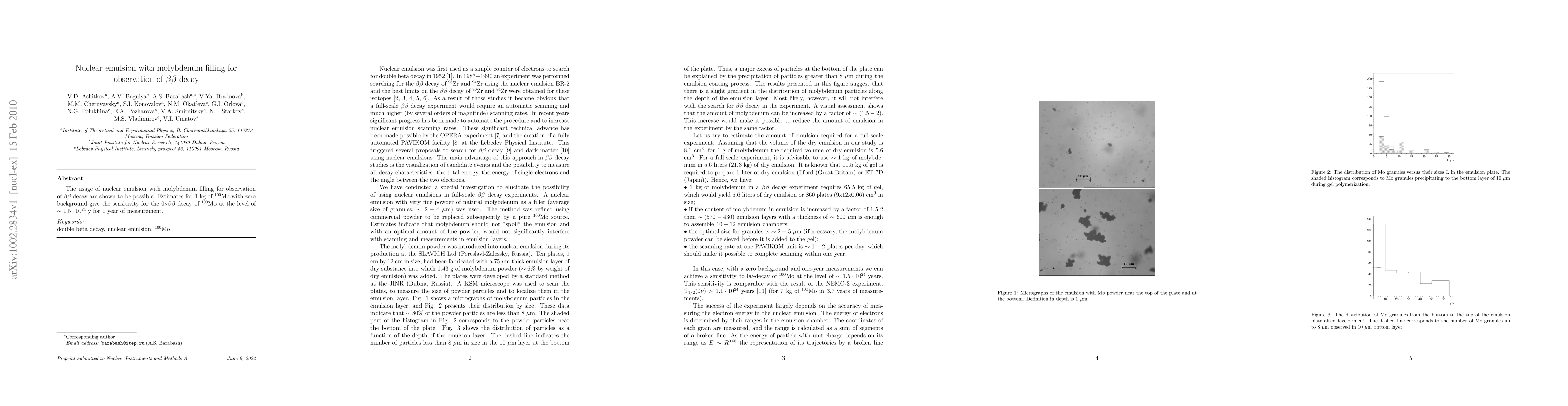 The usage of nuclear emulsion with molybdenum filling for observation of $\beta\beta$ decay are shown to be possible. Estimates for 1 kg of $^{100}$Mo with zero background give the sensitivity for the $0\nu\beta\beta$ decay of $^{100}$Mo at the level of $\sim 1.5\cdot 10^{24}$ y for 1 year of measurement.