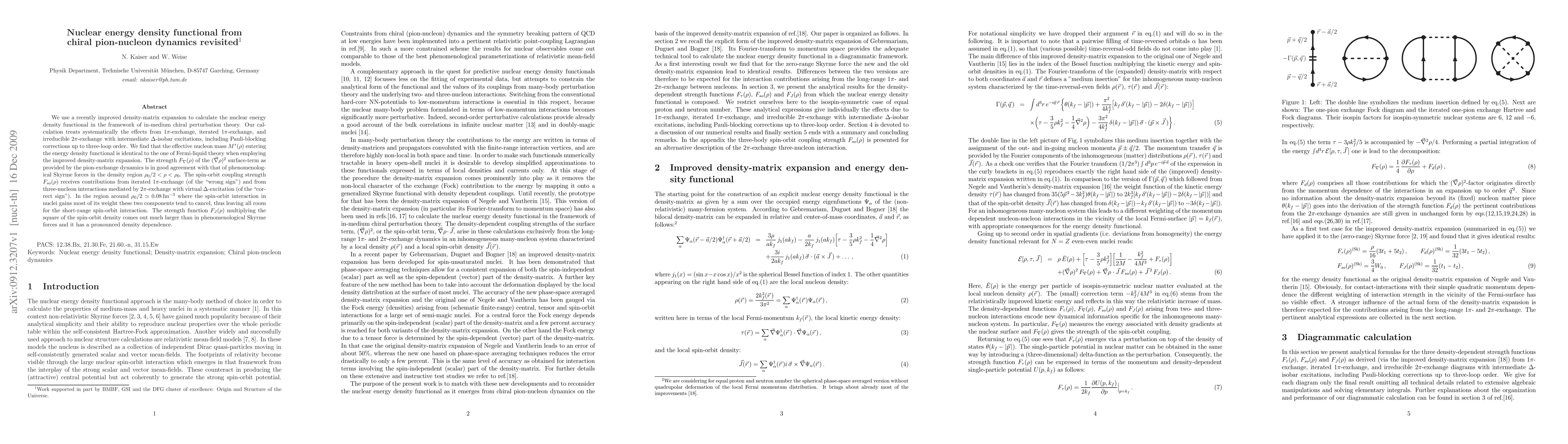 We use a recently improved density-matrix expansion to calculate the nuclear energy density functional in the framework of in-medium chiral perturbation theory. Our calculation treats systematically the effects from $1\pi$-exchange, iterated $1\pi$-exchange, and irreducible $2\pi$-exchange with intermediate $\Delta$-isobar excitations, including Pauli-blocking corrections up to three-loop order. We find that the effective nucleon mass $M^*(\rho)$ entering the energy density functional is identical to the one of Fermi-liquid theory when employing the improved density-matrix expansion. The strength $F_\nabla(\rho)$ of the $(\vec\nabla \rho)^2$ surface-term as provided by the pion-exchange dynamics is in good agreement with that of phenomenological Skyrme forces in the density region $\rho_0/2 <\rho <\rho_0$. The spin-orbit coupling strength $F_{so}(\rho)$ receives contributions from iterated $1\pi$-exchange (of the ``wrong sign'') and from three-nucleon interactions mediated by $2\pi$-exchange with virtual $\Delta$-excitation (of the ``correct sign''). In the region around $\rho_0/2 \simeq 0.08 $fm$^{-3}$ where the spin-orbit interaction in nuclei gains most of its weight these two components tend to cancel, thus leaving all room for the short-range spin-orbit interaction. The strength function $F_J(\rho)$ multiplying the square of the spin-orbit density comes out much larger than in phenomenological Skyrme forces and it has a pronounced density dependence.