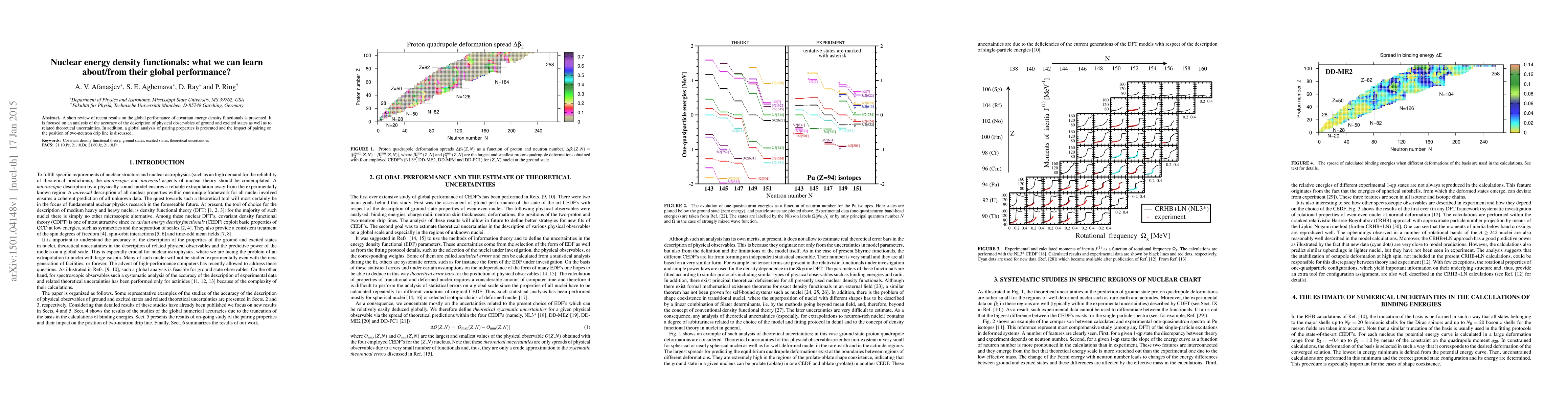 A short review of recent results on the global performance of covariant energy density functionals is presented. It is focused on the analysis of the accuracy of the description of physical observables of ground and excited states as well as to related theoretical uncertainties. In addition, a global analysis of pairing properties is presented and the impact of pairing on the position of two-neutron drip line is discussed.