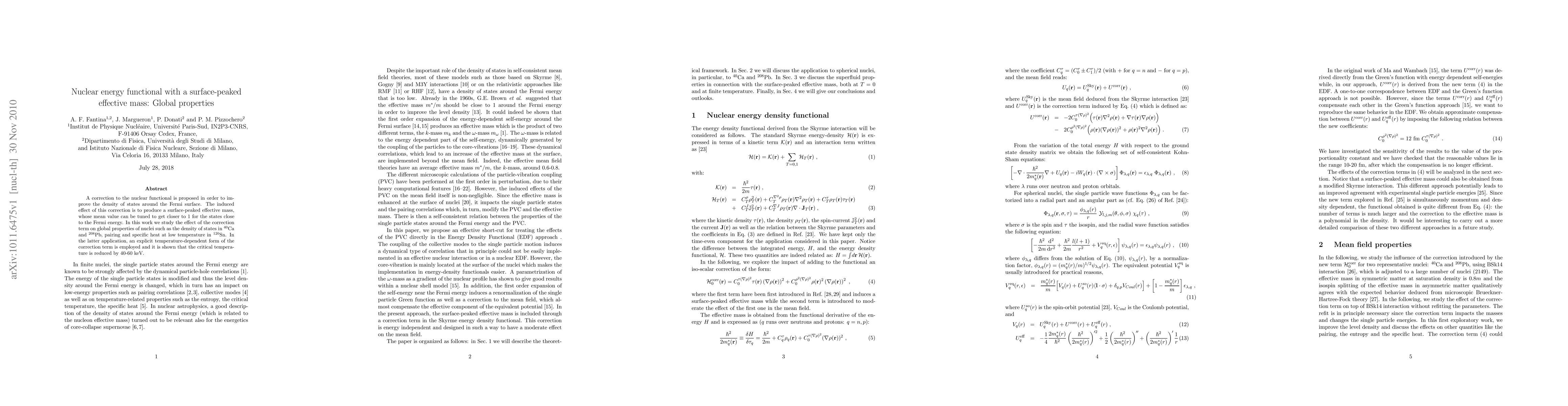 This paper proposes a correction to the nuclear energy functional to enhance the density of states near the Fermi surface, resulting in a surface-peaked effective mass. The study examines the global properties of nuclei, including density of states, pairing, and specific heat, showing a reduction in critical temperature by 40-60 keV in $^{120}$Sn.