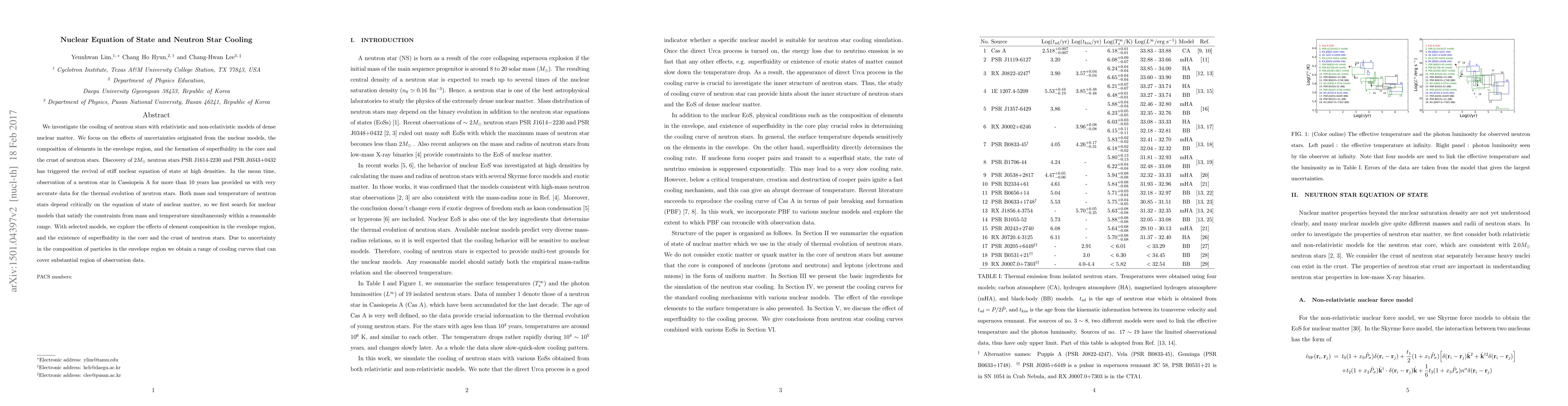 We investigate the cooling of neutron stars with relativistic and non-relativistic models of dense nuclear matter. We focus on the effects of uncertainties originated from the nuclear models, the composition of elements in the envelope region, and the formation of superfluidity in the core and the crust of neutron stars. Discovery of $2 M_\odot$ neutron stars PSR J1614-2230 and PSR J0343+0432 has triggered the revival of stiff nuclear equation of state at high densities. In the mean time, observation of a neutron star in Cassiopeia A for more than 10 years has provided us with very accurate data for the thermal evolution of neutron stars. Both mass and temperature of neutron stars depend critically on the equation of state of nuclear matter, so we first search for nuclear models that satisfy the constraints from mass and temperature simultaneously within a reasonable range. With selected models, we explore the effects of element composition in the evenlope region, and the existence of superfluidity in the core and the crust of neutron stars. Due to uncertainty in the composition of particles in the envelope region we obtain a range of cooling curves that can cover substantial region of observation data.