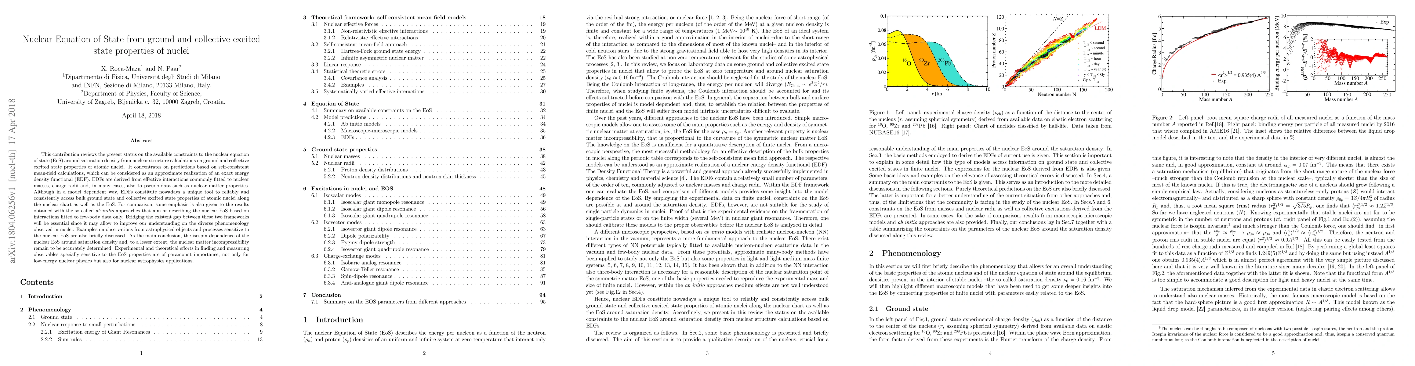 A review paper discusses the current understanding of nuclear equation of state from ground and collective excited state properties of atomic nuclei, highlighting key gaps in knowledge and the need for experimental and theoretical efforts to improve our understanding.
