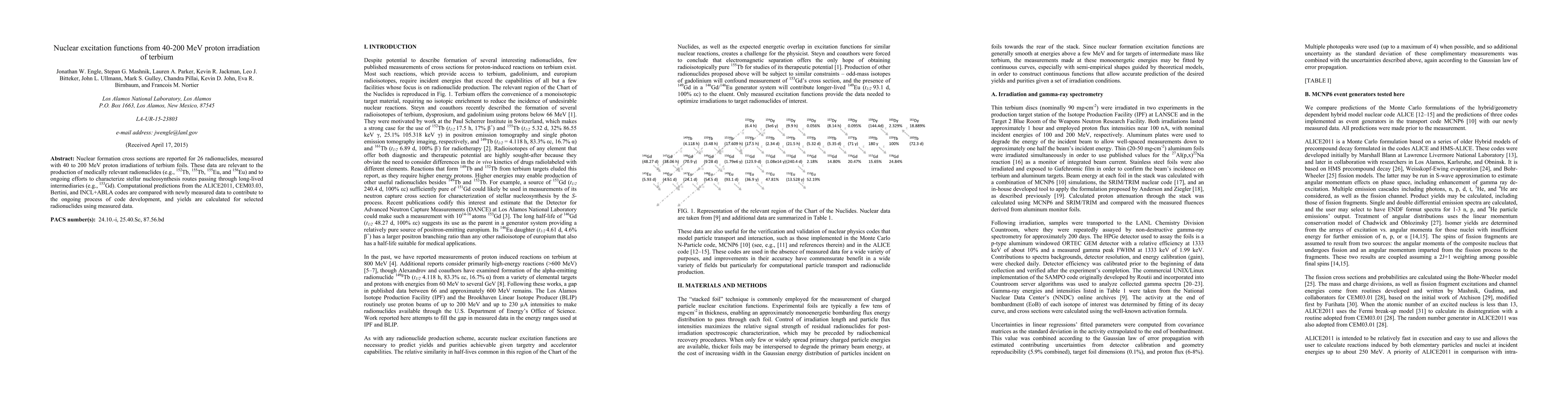 Nuclear formation cross sections are reported for 26 radionuclides, measured with 40 to 200 MeV proton irradiations of terbium foils. These data are relevant to the production of medically relevant radionuclides (e.g., 152Tb, 155Tb, 155Eu, and 156Eu) and to ongoing efforts to characterize stellar nucleosynthesis routes passing through long-lived intermediaries (e.g., 153Gd). Computational predictions from the ALICE2011, CEM03.03, Bertini, and INCL+ABLA codes are compared with newly measured data to contribute to the ongoing process of code development, and yields are calculated for selected radionuclides using measured data.