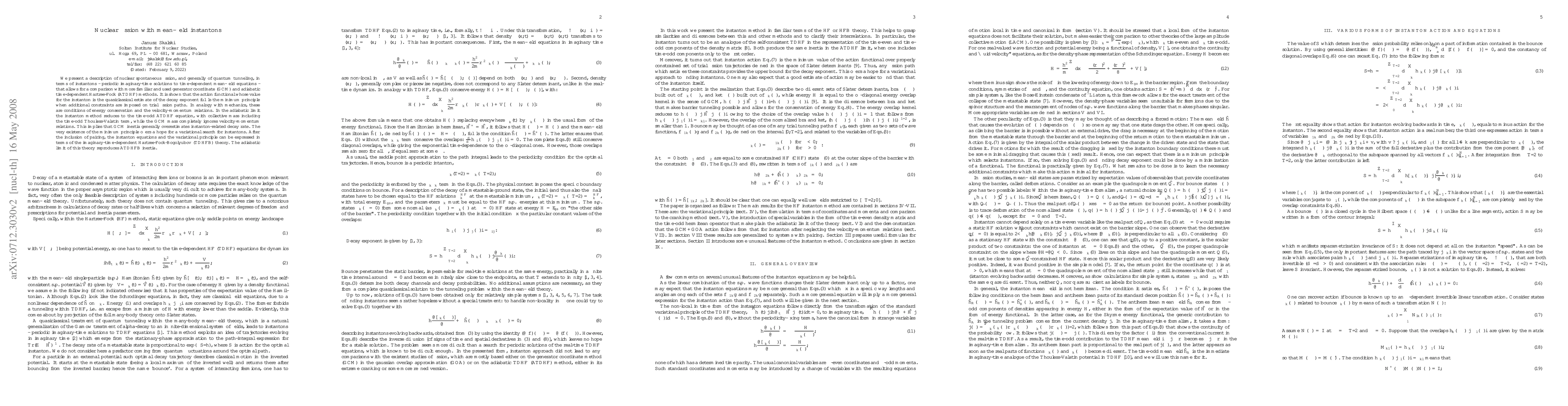 This paper describes nuclear spontaneous fission using instantons, periodic imaginary-time solutions to mean-field equations, and compares it with generator coordinate and adiabatic time-dependent Hartree-Fock methods. It demonstrates that the instanton method adheres to a minimum principle under certain constraints, leading to more accurate decay rate estimates compared to generator coordinate methods.