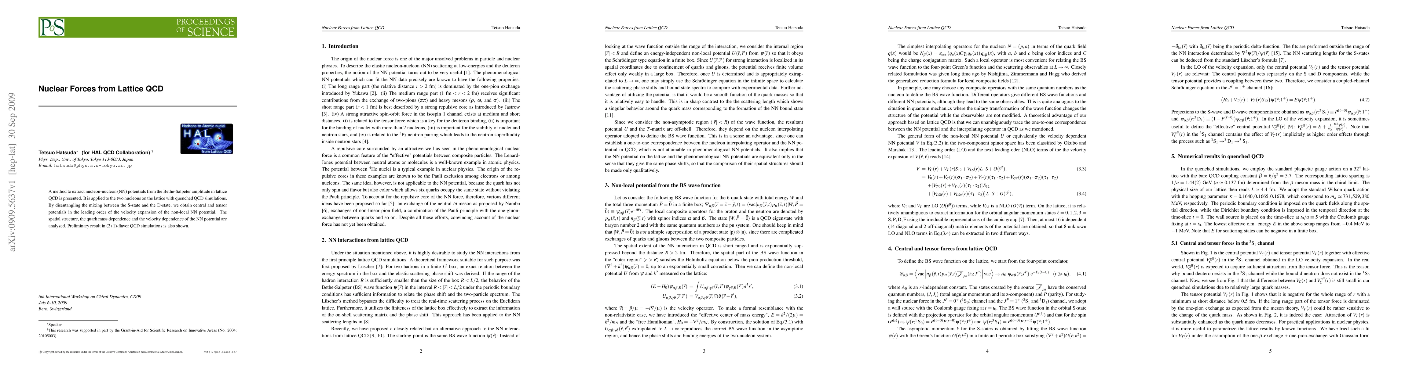 A method to extract nucleon-nucleon (NN) potentials from the Bethe-Salpeter amplitude in lattice QCD is presented. It is applied to the two nucleons on the lattice with quenched QCD simulations. By disentangling the mixing between the S-state and the D-state, we obtain central and tensor potentials in the leading order of the velocity expansion of the non-local NN potential. The spatial structure, the quark mass dependence and the velocity dependence of the NN potential are analyzed. Preliminary result in (2+1)-flavor QCD simulations is also shown.