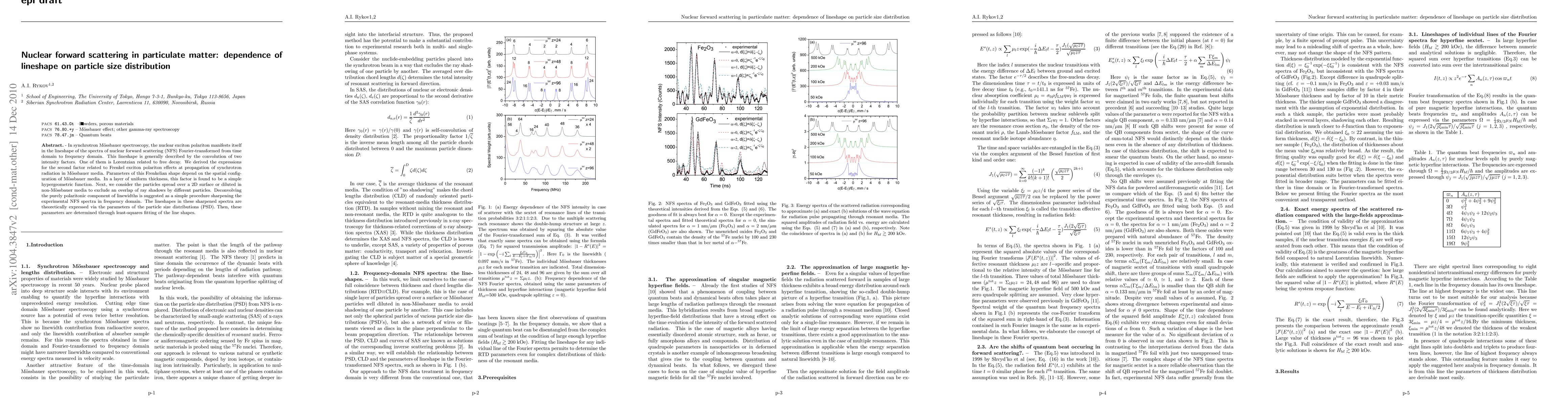 In synchrotron Moessbauer spectroscopy, the nuclear exciton polariton manifests itself in the lineshape of the spectra of nuclear forward scattering (NFS) Fourier-transformed from time domain to frequency domain. This lineshape is generally described by the convolution of two intensity factors. One of them is Lorentzian related to free decay. We derived the expressions for the second factor related to Frenkel exciton polariton effects at propagation of synchrotron radiation in Moessbauer media. Parameters of this Frenkelian shape depend on the spatial configuration of Moessbauer media. In a layer of uniform thickness, this factor is found to be a simple hypergeometric function. Next, we consider the particles spread over a 2D surface or diluted in non-Moessbauer media to exclude an overlap of ray shadows by different particles. Deconvolving the purely polaritonic component of linewidths is suggested as a simple procedure sharpening the experimental NFS spectra in frequency domain. The lineshapes in these sharpened spectra are theoretically expressed via the parameters of the particle size distributions (PSD). Then, these parameters are determined through least-squares fitting of the line shapes.