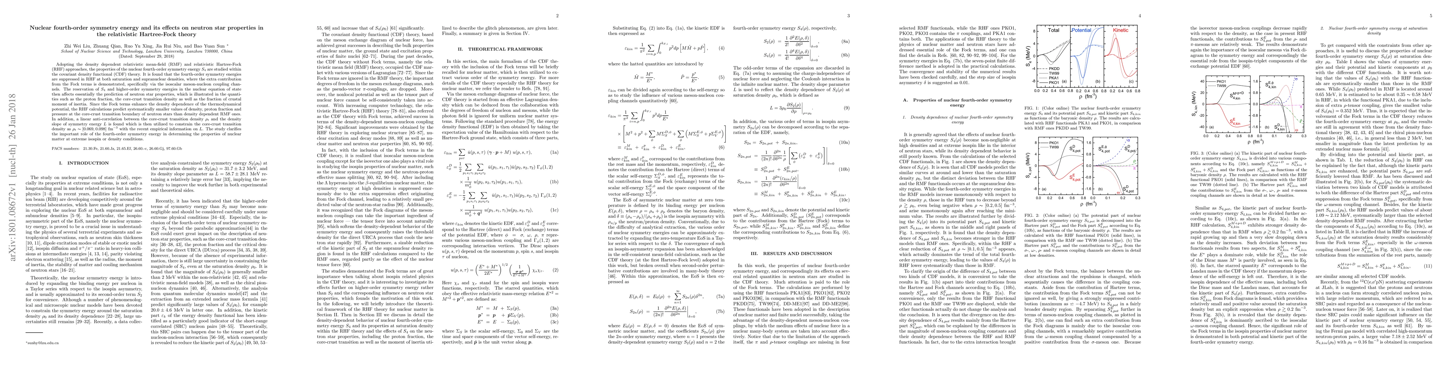 Adopting the density dependent relativistic mean-field (RMF) and relativistic Hartree-Fock (RHF) approaches, the properties of the nuclear fourth-order symmetry energy $S_4$ are studied within the covariant density functional (CDF) theory. It is found that the fourth-order symmetry energies are suppressed in RHF at both saturation and supranuclear densities, where the extra contribution from the Fock terms is demonstrated, specifically via the isoscalar meson-nucleon coupling channels. The reservation of $S_4$ and higher-order symmetry energies in the nuclear equation of state then affects essentially the prediction of neutron star properties, which is illustrated in the quantities such as the proton fraction, the core-crust transition density as well as the fraction of crustal moment of inertia. Since the Fock terms enhance the density dependence of the thermodynamical potential, the RHF calculations predict systematically smaller values of density, proton fraction and pressure at the core-crust transition boundary of neutron stars than density dependent RMF ones. In addition, a linear anti-correlation between the core-crust transition density $\rho_t$ and the density slope of symmetry energy $L$ is found which is then utilized to constrain the core-crust transition density as $\rho_t\thicksim[0.069, 0.098]~\rm{fm}^{-3}$ with the recent empirical information on $L$. The study clarifies the important role of the fourth-order symmetry energy in determining the properties of nuclear matter at extreme isospin or density conditions.