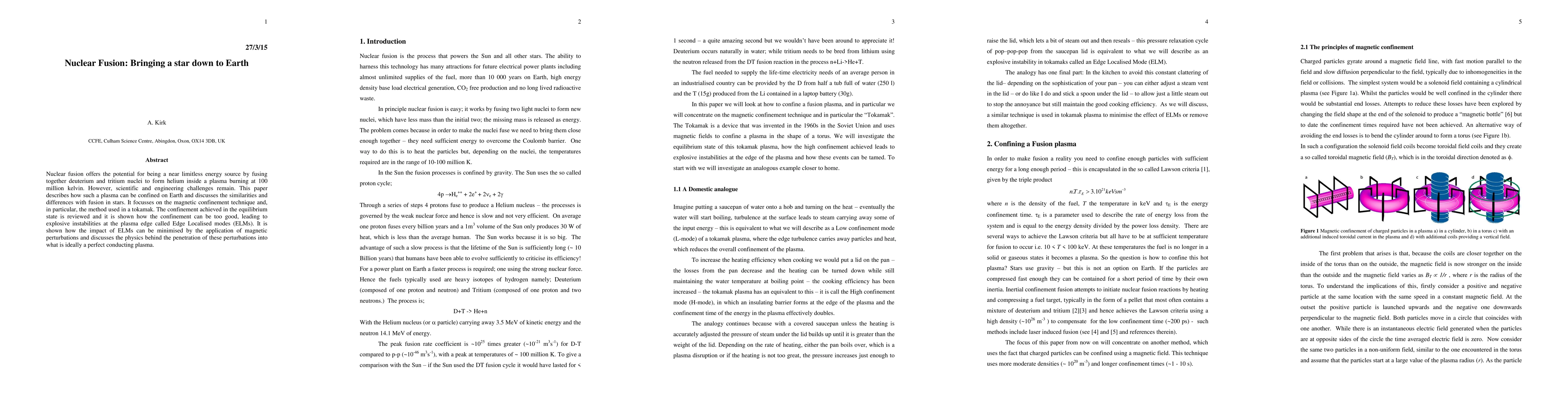 Nuclear fusion offers the potential for being a near limitless energy source by fusing together deuterium and tritium nuclei to form helium inside a plasma burning at 100 million kelvin. However, scientific and engineering challenges remain. This paper describes how such a plasma can be confined on Earth and discusses the similarities and differences with fusion in stars. It focusses on the magnetic confinement technique and, in particular, the method used in a tokamak. The confinement achieved in the equilibrium state is reviewed and it is shown how the confinement can be too good, leading to explosive instabilities at the plasma edge called Edge Localised modes (ELMs). It is shown how the impact of ELMs can be minimised by the application of magnetic perturbations and discusses the physics behind the penetration of these perturbations into what is ideally a perfect conducting plasma.