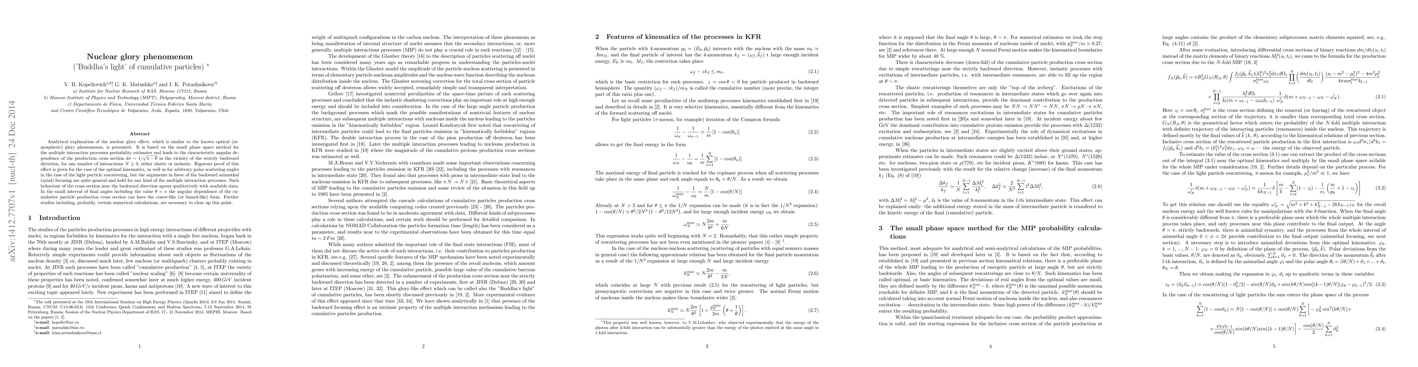 Analytical explanation of the nuclear glory effect, which is similar to the known optical (atmospheric) glory phenomenon, is presented. It is based on the small phase space method for the multiple interaction processes probability estimates and leads to the characteristic angular dependence of the production cross section $d\sigma \sim 1/ \sqrt {\pi - \theta}$ in the vicinity of the strictly backward direction, for any number of interactions $N\geq 3$, either elastic or inelastic. Rigorous proof of this effect is given for the case of the optimal kinematics, as well as for arbitrary polar scattering angles in the case of the light particle rescattering, but the arguments in favor of the backward azimuthal (axial) focusing are quite general and hold for any kind of the multiple interaction processes. Such behaviour of the cross section near the backward direction agrees qualitatively with available data. In the small interval of final angles including the value $\theta =\pi$ the angular dependence of the cumulative particle production cross section can have the crater-like (or funnel-like) form. Further studies including, probably, certain numerical calculations, are necessary to clear up this point.