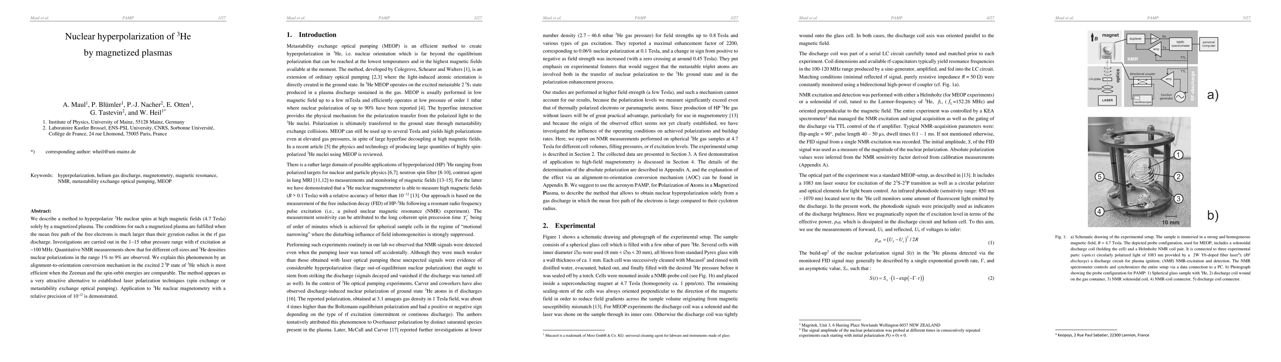 We describe a method to hyperpolarize 3He nuclear spins at high magnetic fields (4.7 Tesla) solely by a magnetized plasma. The conditions for such a magnetized plasma are fulfilled when the mean free path of the free electrons is much larger than their gyration radius in the rf gas discharge. Investigations are carried out in the 1-15 mbar pressure range with rf excitation at ~100 MHz. Quantitative NMR measurements show that for different cell sizes and 3He densities nuclear polarizations in the range 1% to 9% are observed. We explain this phenomenon by an alignment-to-orientation conversion mechanism in the excited 2 3P state of 3He which is most efficient when the Zeeman and the spin-orbit energies are comparable. The method appears as a very attractive alternative to established laser polarization techniques (spin exchange or metastability exchange optical pumping). Application to 3He nuclear magnetometry with a relative precision of 10-12 is demonstrated.