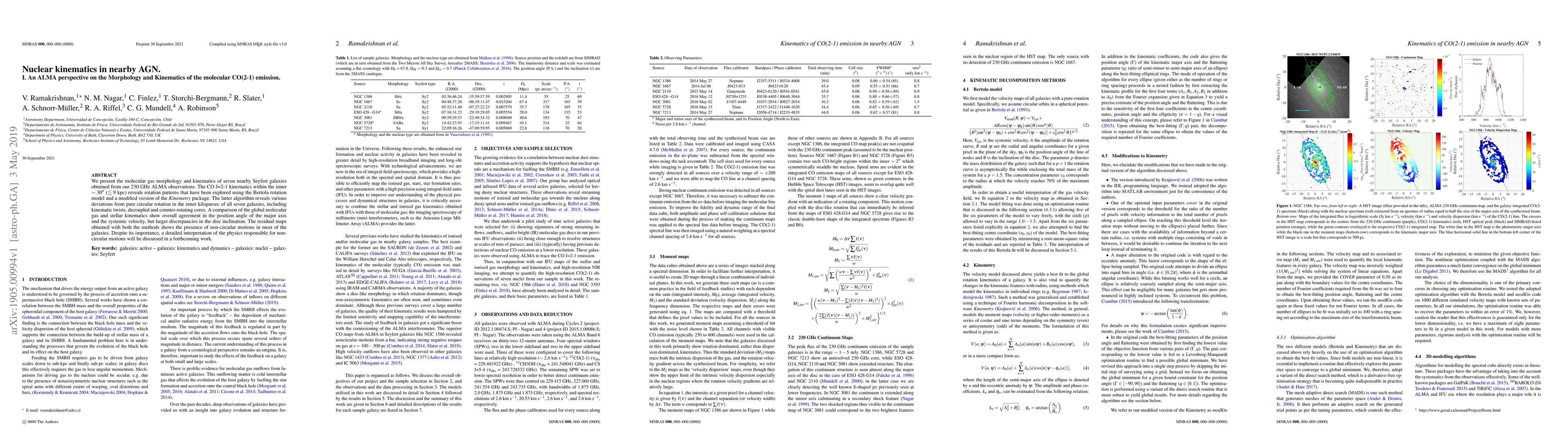 We present the molecular gas morphology and kinematics of seven nearby Seyfert galaxies obtained from our 230~GHz ALMA observations. The CO J=2-1 kinematics within the inner $\sim30$" ($\lesssim9$~kpc) reveals rotation patterns that have been explored using the Bertola rotation model and a modified version of the Kinemetry package. The latter algorithm reveals various deviations from pure circular rotation in the inner kiloparsec of all seven galaxies, including kinematic twists, decoupled and counter-rotating cores. A comparison of the global molecular gas and stellar kinematics show overall agreement in the position angle of the major axis and the systemic velocity, but larger discrepancies in the disc inclination. The residual maps obtained with both the methods shows the presence of non-circular motions in most of the galaxies. Despite its importance, a detailed interpretation of the physics responsible for non-circular motions will be discussed in a forthcoming work.