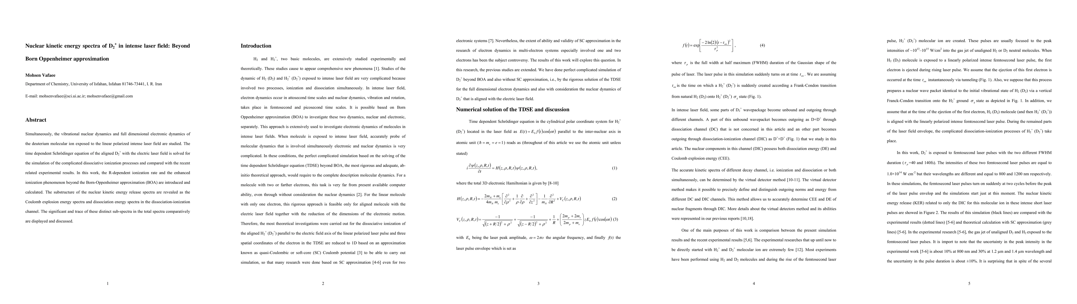 This paper investigates the nuclear kinetic energy spectra of D₂⁺ in intense laser fields, beyond the Born-Oppenheimer approximation, by solving the time-dependent Schrödinger equation. It reveals the substructure of the nuclear kinetic energy release spectra, including Coulomb explosion and dissociation energy spectra, and discusses the enhanced ionization phenomenon.