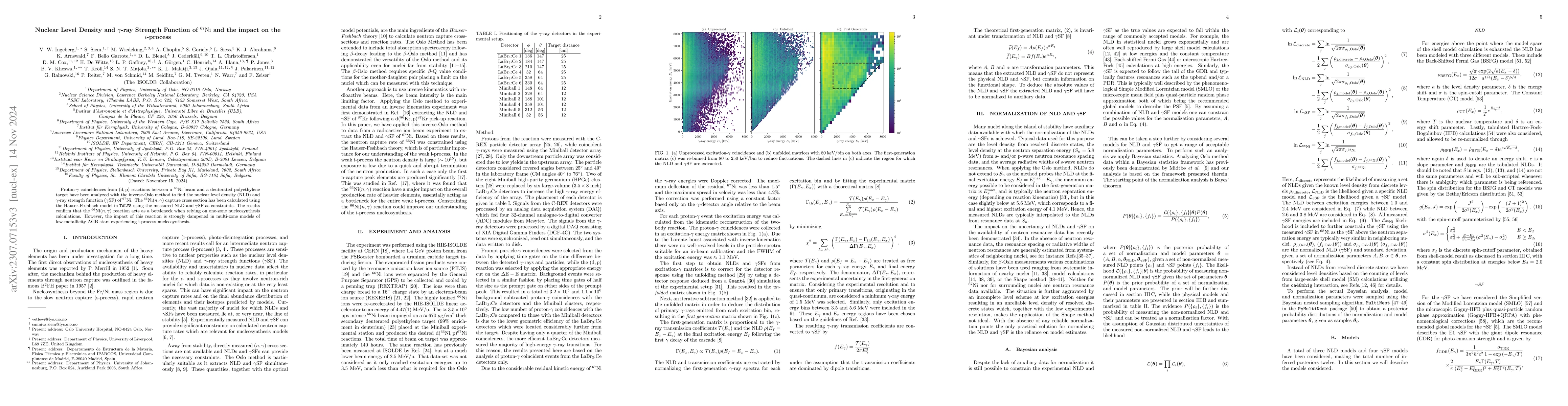 This study investigates the nuclear level density and $\gamma$-ray strength function of $^{67}\mathrm{Ni}$ using proton-$\gamma$ coincidences from $(\mathrm{d},\mathrm{p})$ reactions. The results show that the $^{66}\mathrm{Ni}(\mathrm{n},\gamma)$ reaction is a bottleneck in one-zone nucleosynthesis but has a reduced impact in multi-zone low-metallicity AGB stellar models.