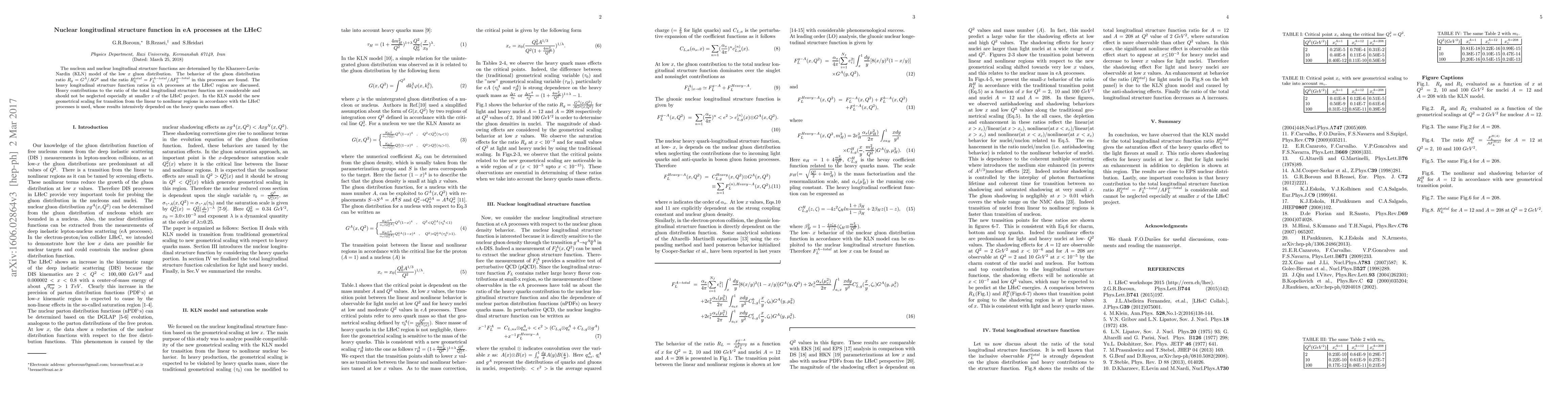 The nucleon and nuclear longitudinal structure functions are determined by the Kharzeev-Levin-Nardin (KLN) model of the low $x$ gluon distribution. The behavior of the gluon distribution ratio $R_{g}={G^{A}}/{AG^{p}}$ and the ratio $R_{L}^{total}={F_{L}^{A-total}}/{AF_{L}^{p-total}}$ in this processes are found. The heavy longitudinal structure function ratios in eA processes at the LHeC region are discussed. Heavy contributions to the ratio of the total longitudinal structure function are considerable and should not be neglected especially at smaller $x$ of the LHeC project. In the KLN model the new geometrical scaling for transition from the linear to nonlinear regions in accordance with the LHeC processes is used, whose results intensively depended on the heavy quarks mass effect.