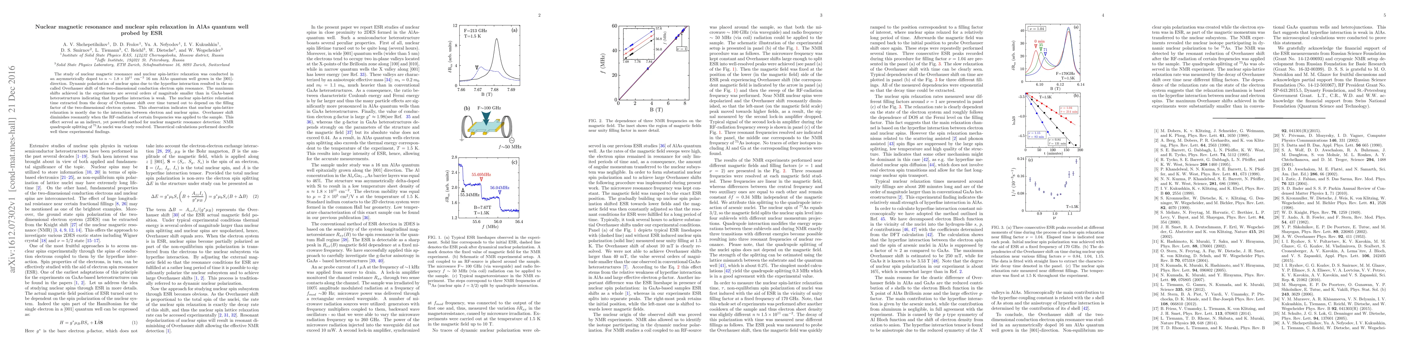 This study investigates nuclear magnetic resonance and nuclear spin-lattice relaxation in an asymmetrically doped AlAs quantum well using ESR, revealing weak hyperfine interaction and significant electron-nuclear spin interaction dependence on the filling factor. The Overhauser shift method enabled detection of NMR quadrupole splitting of $^{75}$As nuclei.