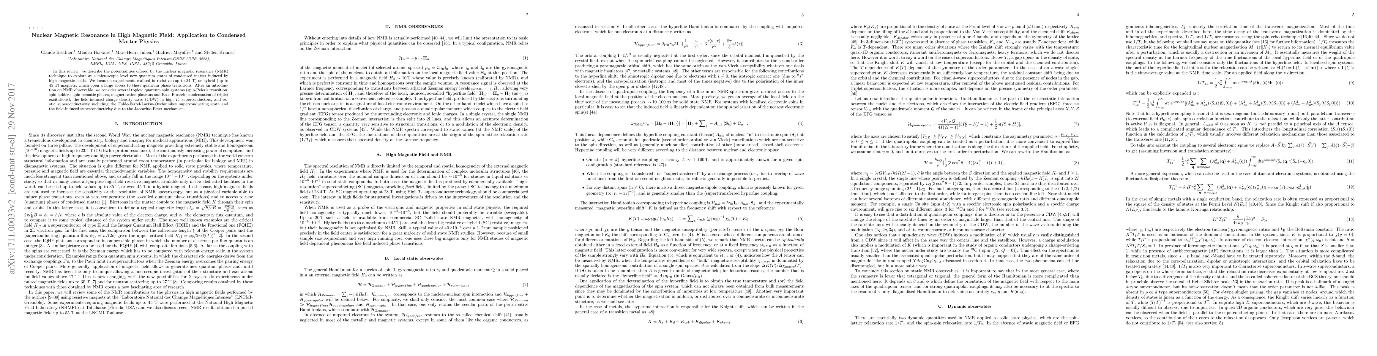This paper reviews the application of nuclear magnetic resonance (NMR) in high magnetic fields to explore quantum states in condensed matter physics, focusing on phenomena like spin systems, charge density waves, and exotic superconductivity observed in resistive and hybrid magnets.
