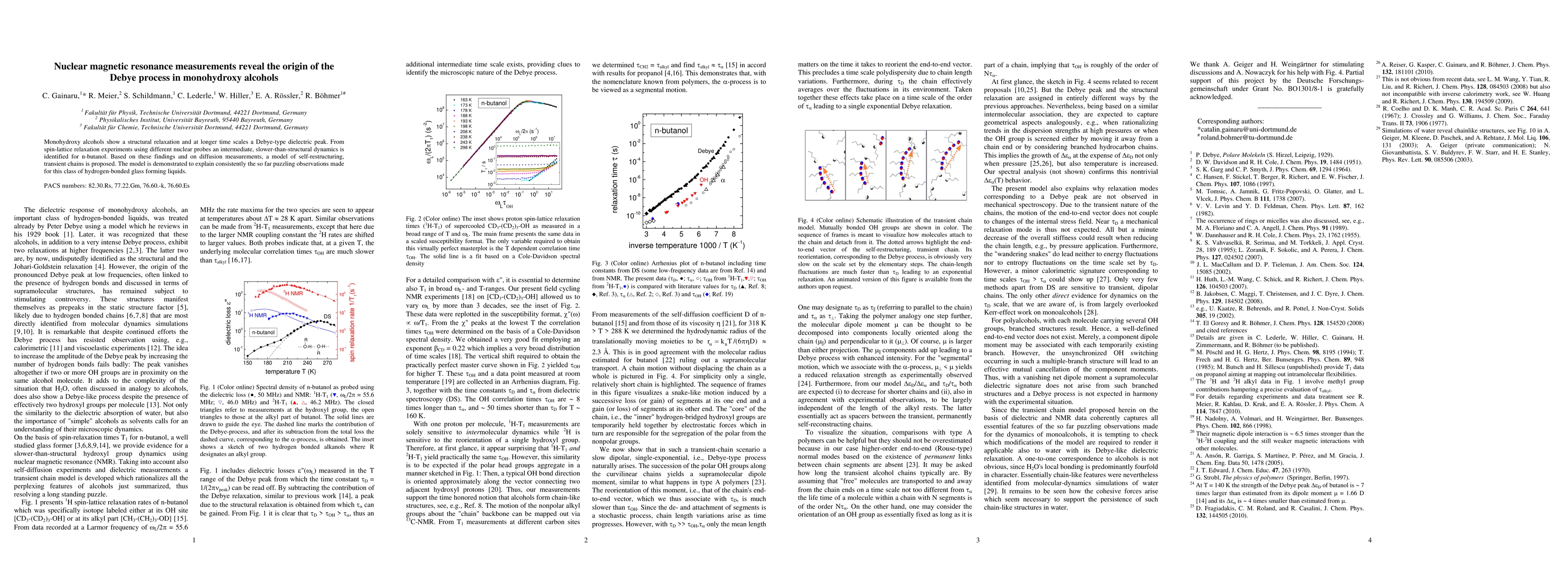 Monohydroxy alcohols show a structural relaxation and at longer time scales a Debye-type dielectric peak. From spin-lattice relaxation experiments using different nuclear probes an intermediate, slower-than-structural dynamics is identified for n-butanol. Based on these findings and on diffusion measurements, a model of self-restructuring, transient chains is proposed. The model is demonstrated to explain consistently the so far puzzling observations made for this class of hydrogen-bonded glass forming liquids.