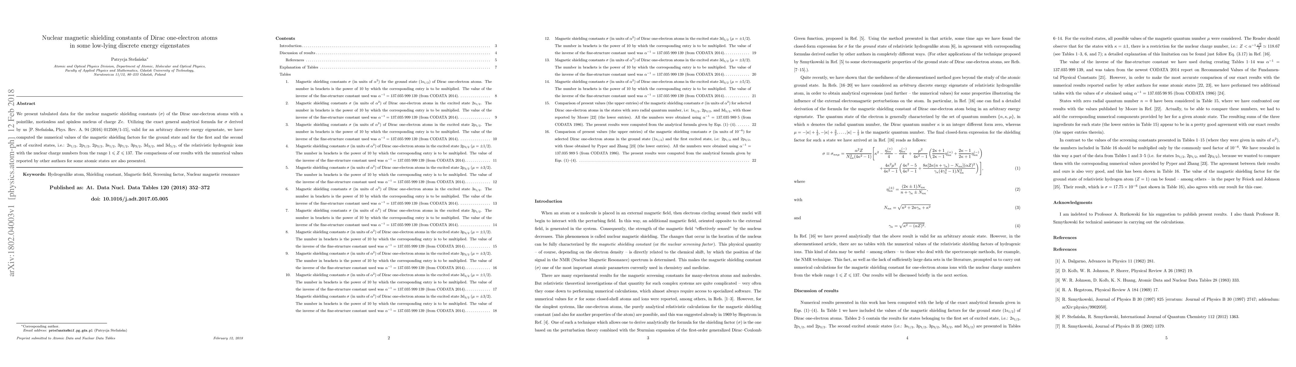 This paper presents computed nuclear magnetic shielding constants for Dirac one-electron atoms in various low-lying energy states using an exact analytical formula. The results are compared with previous studies for selected atomic states.