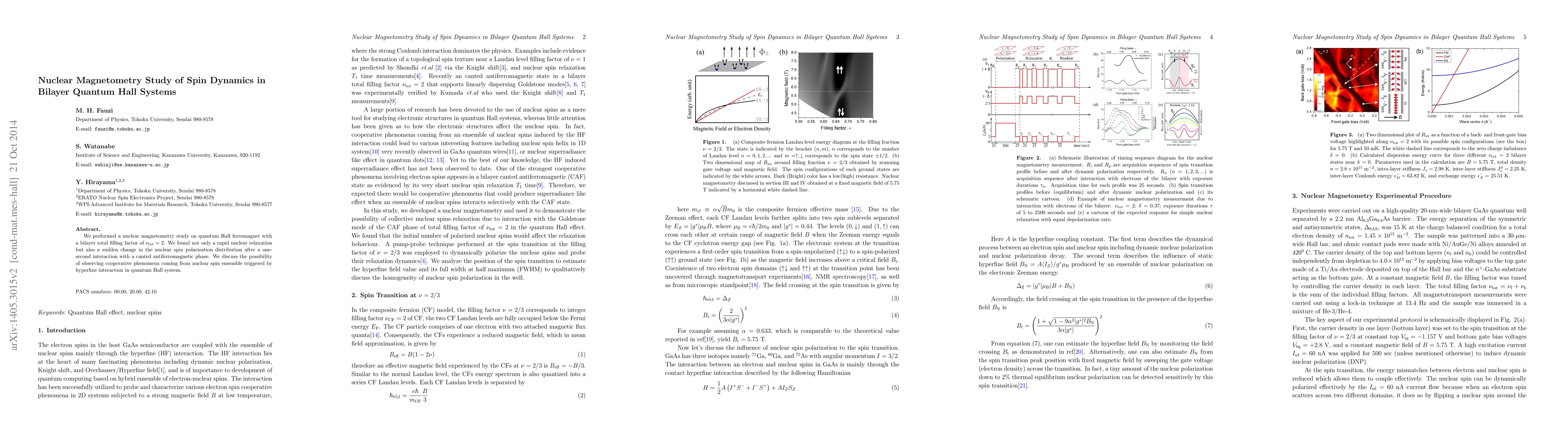We performed a nuclear magnetometry study on quantum Hall ferromagnet with a bilayer total filling factor of $\nu_{\rm{tot}} = 2$. We found not only a rapid nuclear relaxation but also a sudden change in the nuclear spin polarization distribution after a one-second interaction with a canted antiferromagnetic phase. We discuss the possibility of observing cooperative phenomena coming from nuclear spin ensemble triggered by electrons with collective spin interactions.